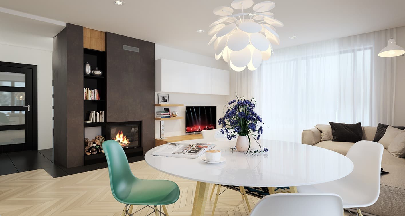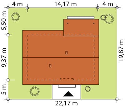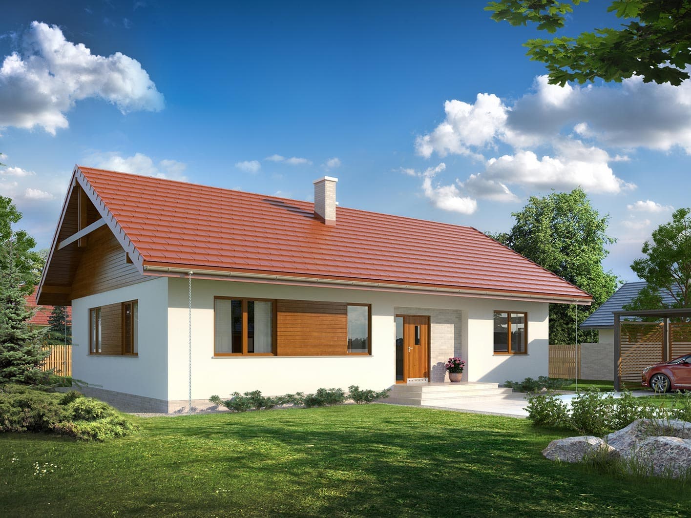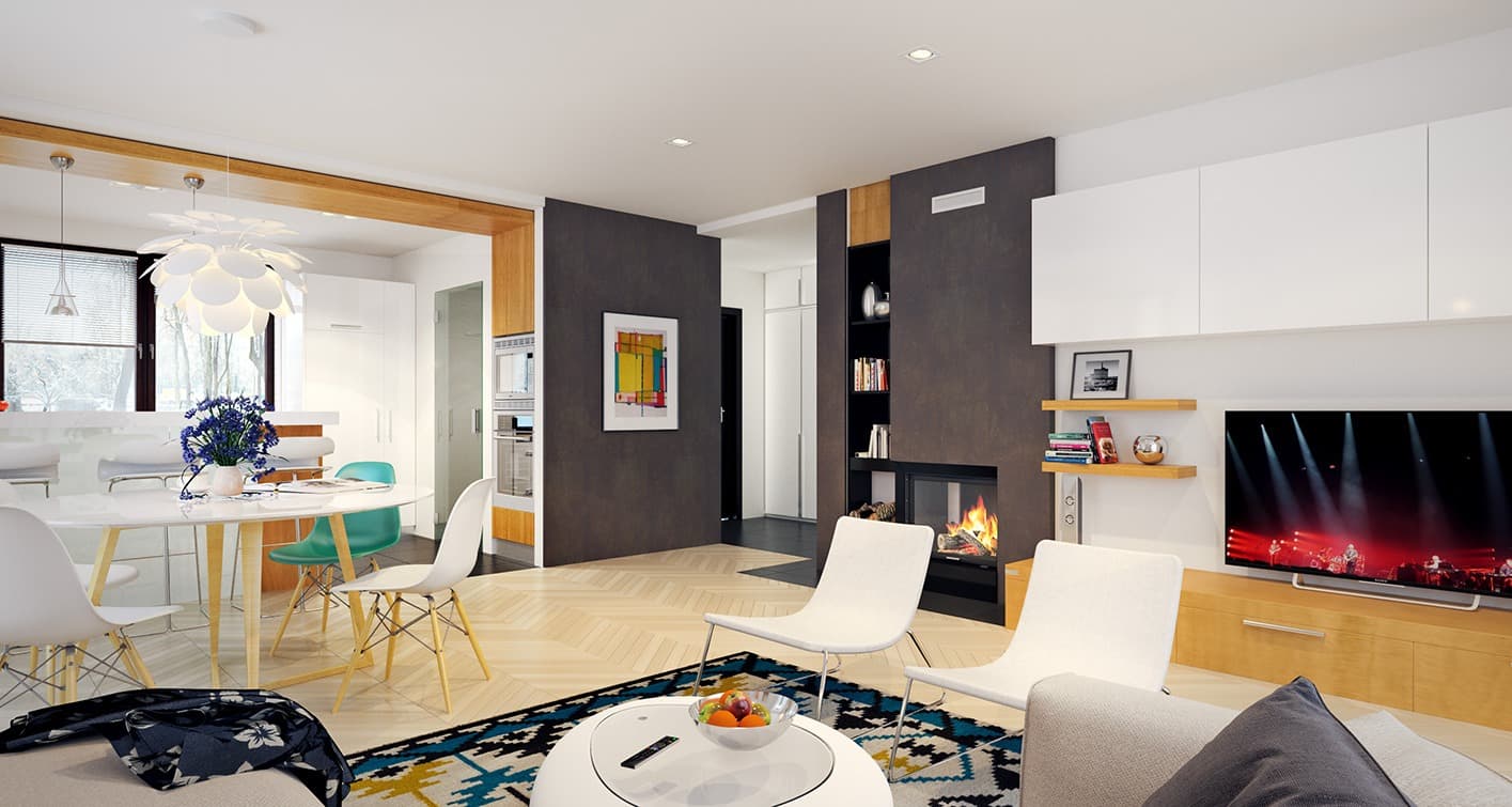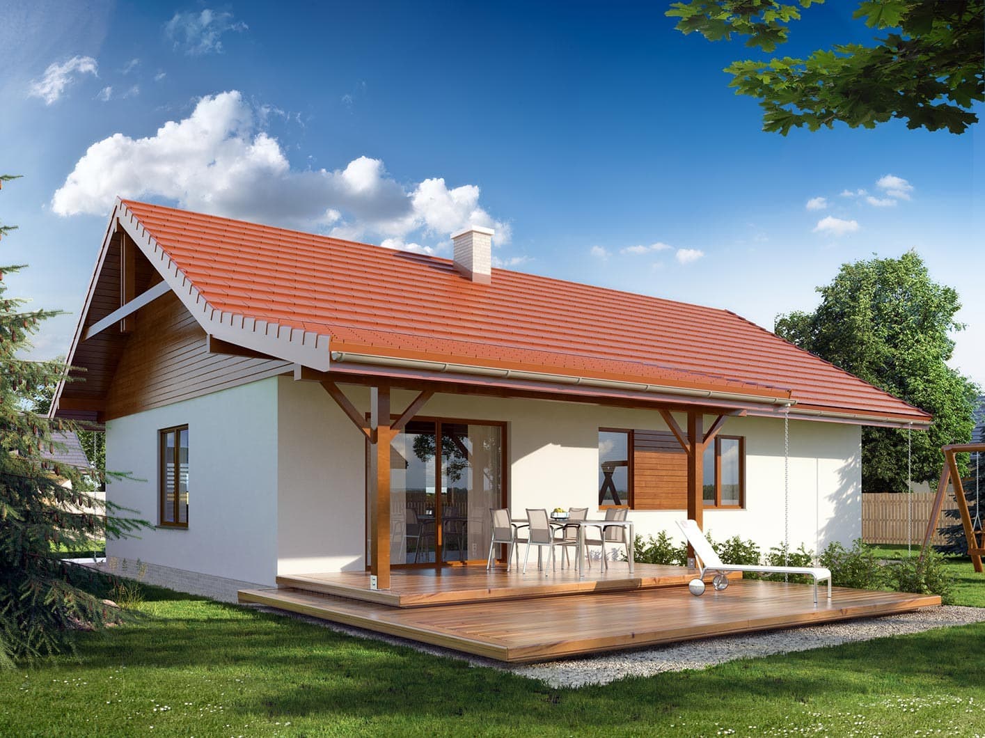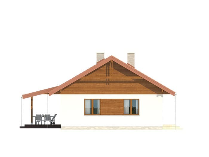Dom jednorodzinny, parterowy, niepodpiwniczony, wykonany w technologii szkieletu drewnianego. Wygodny, funkcjonalny, z optymalnie rozplanowaną przestrzenią. Przestronny salon połączony z kuchnią otwiera się na duży, zadaszony taras. Posioda spiżarnię dostępną z kuchni oraz kotłownię z możliwością zastosowania kotła na paliwo stałe. Dom jest tani i prosty w budowie a przez zastosowanie rozwiązań energooszczędnych również niedrogi w utrzymaniu. Projekt dostępny również w technologii murowanej.