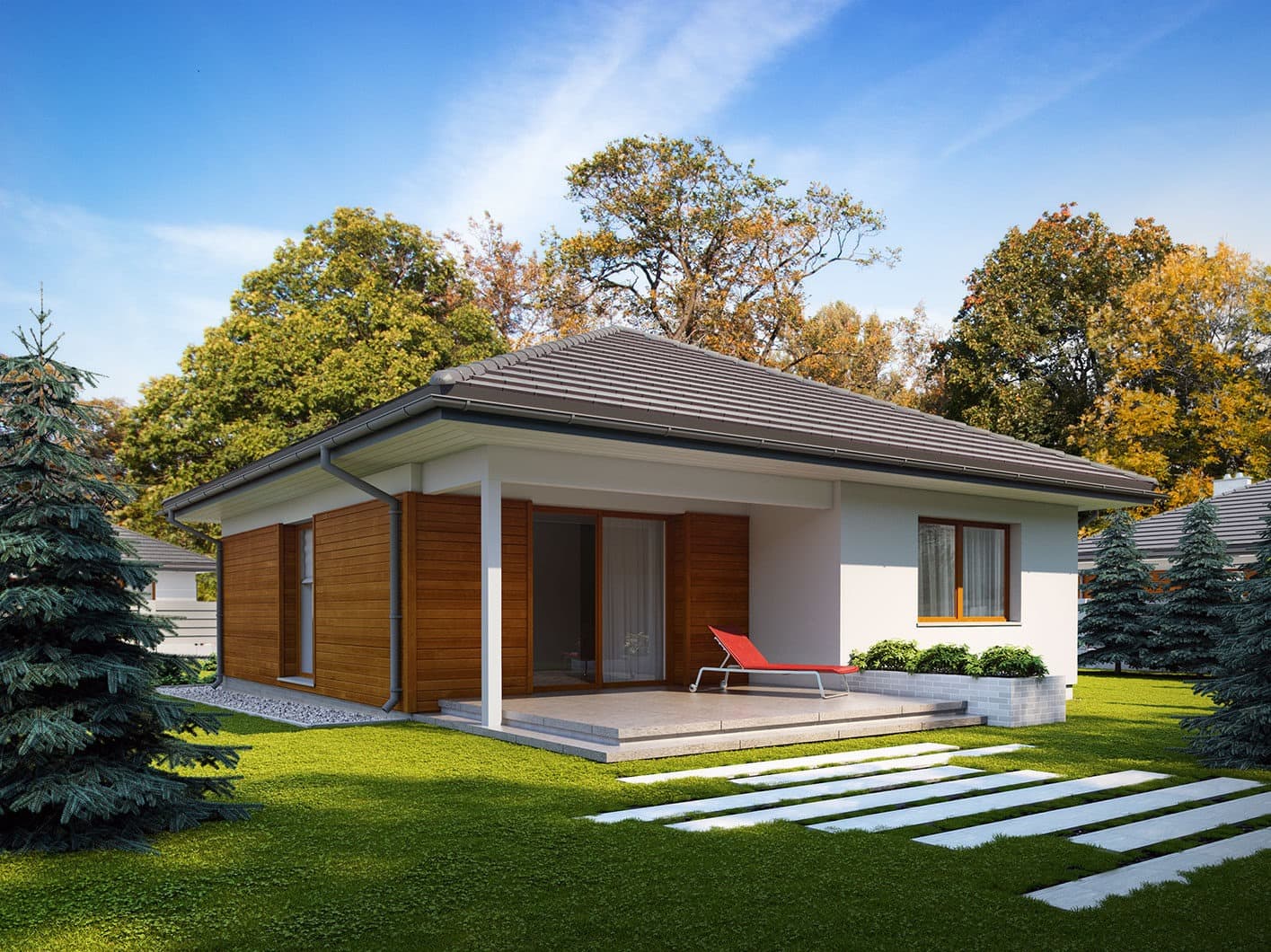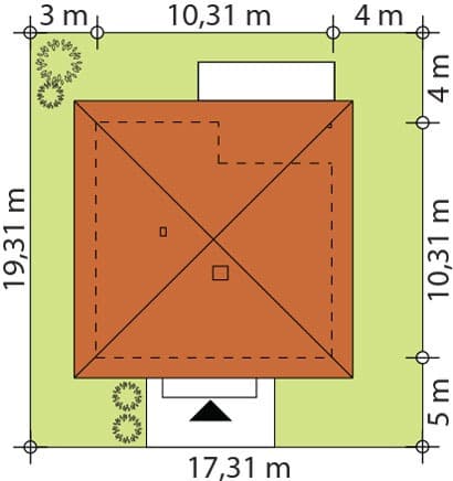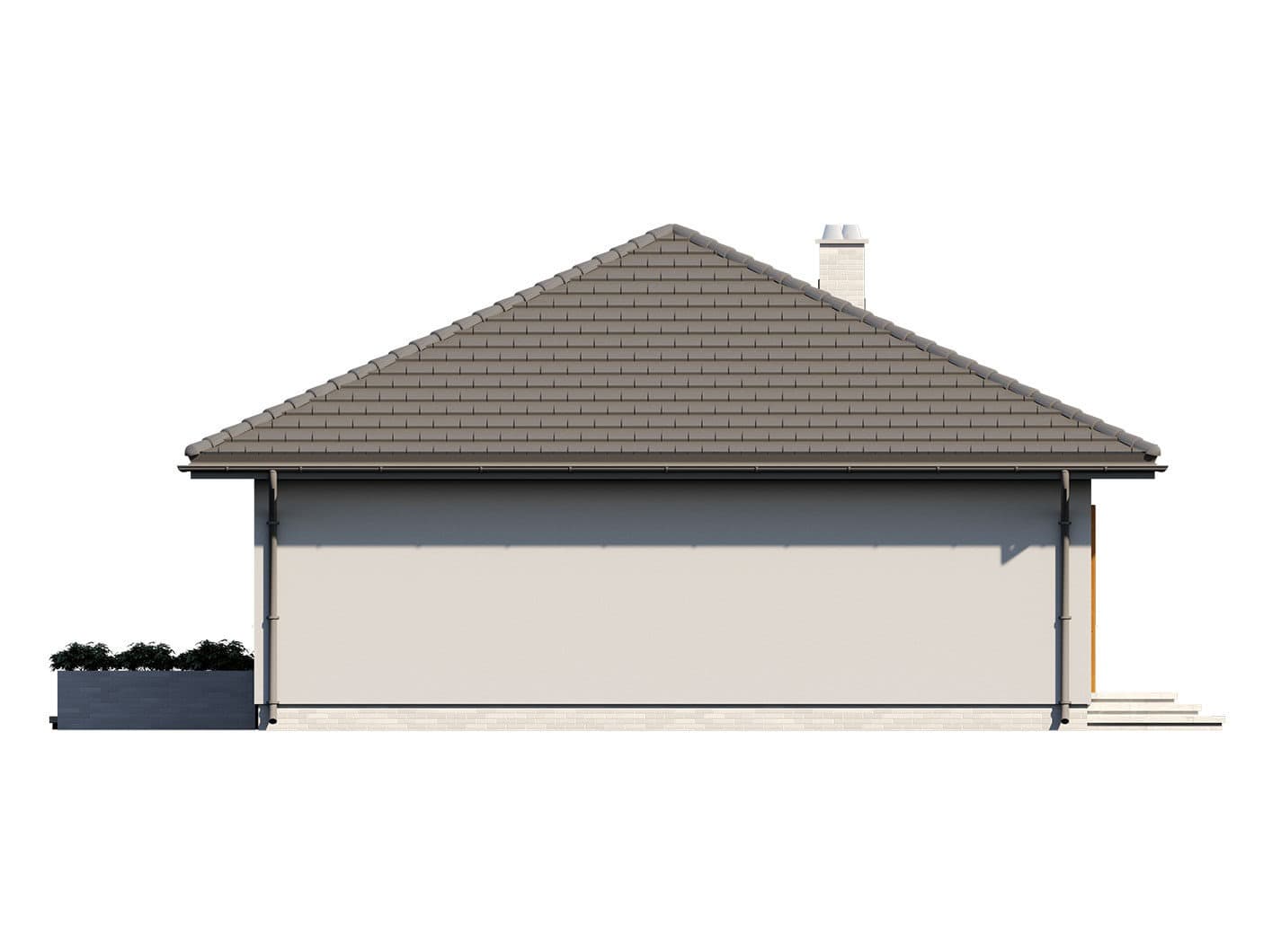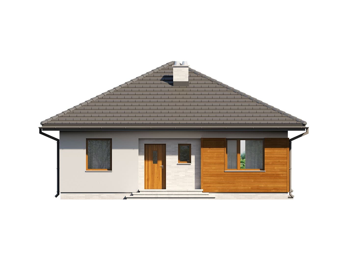 Elsa drewniana to projekt parterowego domu jednorodzinnego zapewniającego optymalne potrzeby 3-4-osobowej rodziny. Jest to dom bardzo funkcjonalny z wyraźnym podziałem na strefy. Przestronna część dzienna to proste i klasyczne połączenie salonu, jadalni i kuchni, zaś strefa intymna składa się z 2 sypialni i łazienki. Plusem projektu jest dodatkowe pomieszczenie gospodarcze, które można przeznaczyć na pralnię lub spiżarnię. Dom posiada duży taras umożliwiający spędzanie czasu na świeżym powietrzu niezależnie od warunków pogodowych. Wejście do domu jest przez niewielki podcień chroniący przed deszczem i słońcem. Z samego wiatrołapu prowadzi wejście do dużej kotłowni na każdy rodzaj paliwa. Bryła budynku zamknięta jest na rzucie kwadratu, przykrytego czterospadowym dachem. Taka forma budynku czyni go prostym w budowie i tanim w eksploatacji.