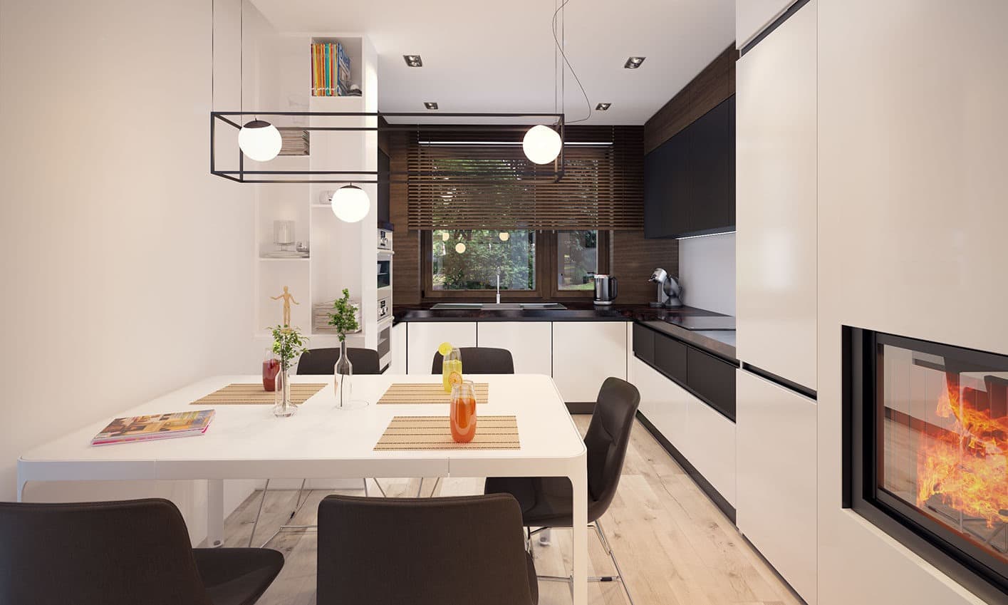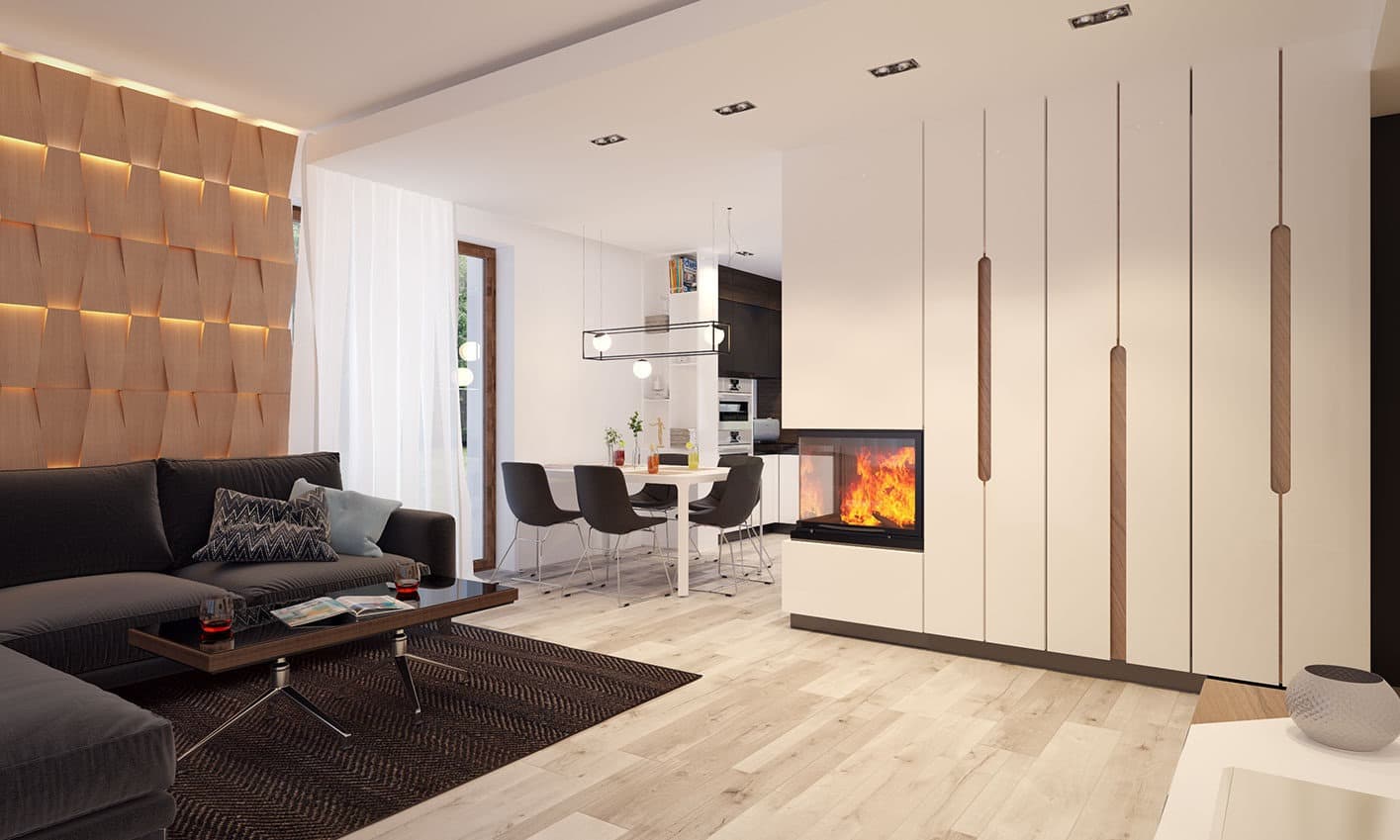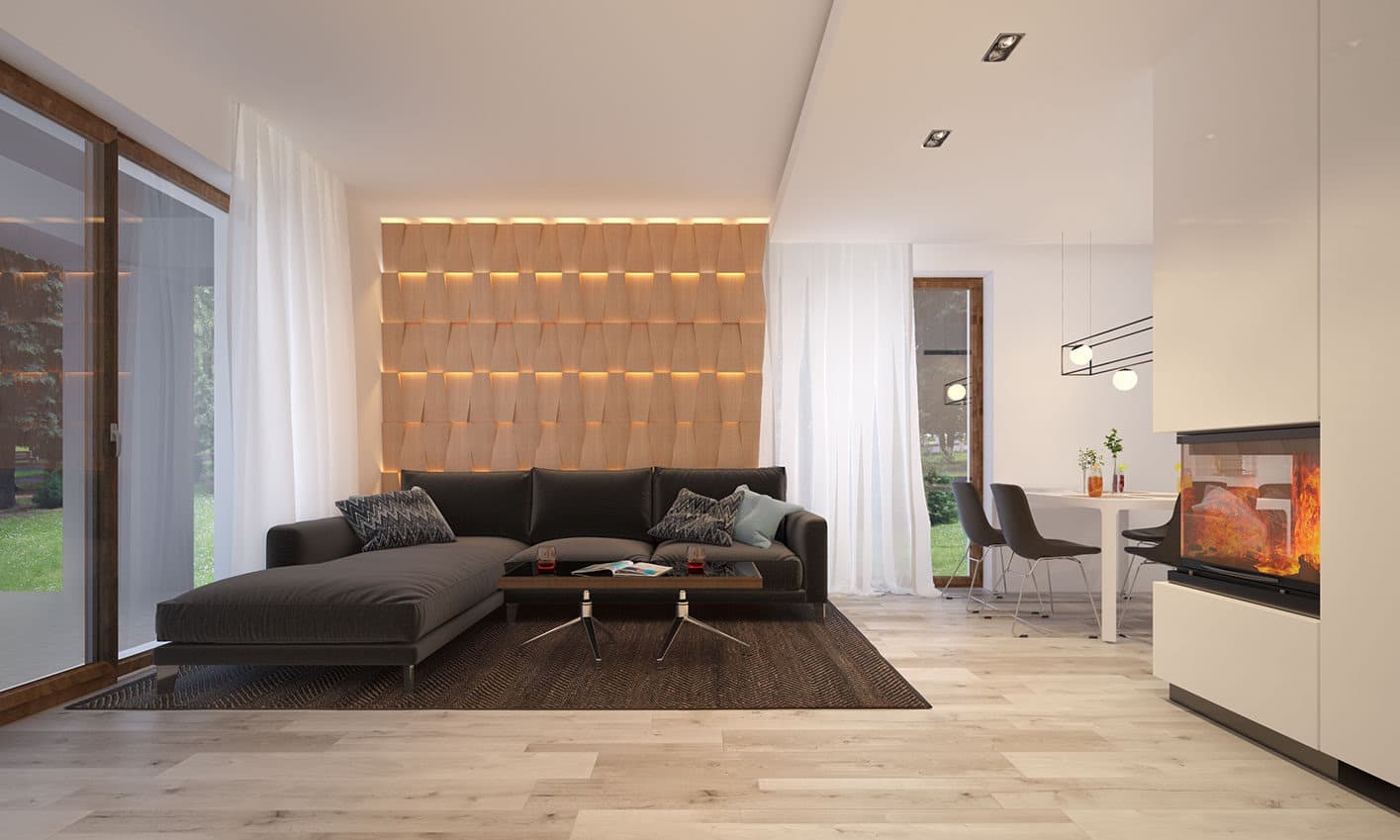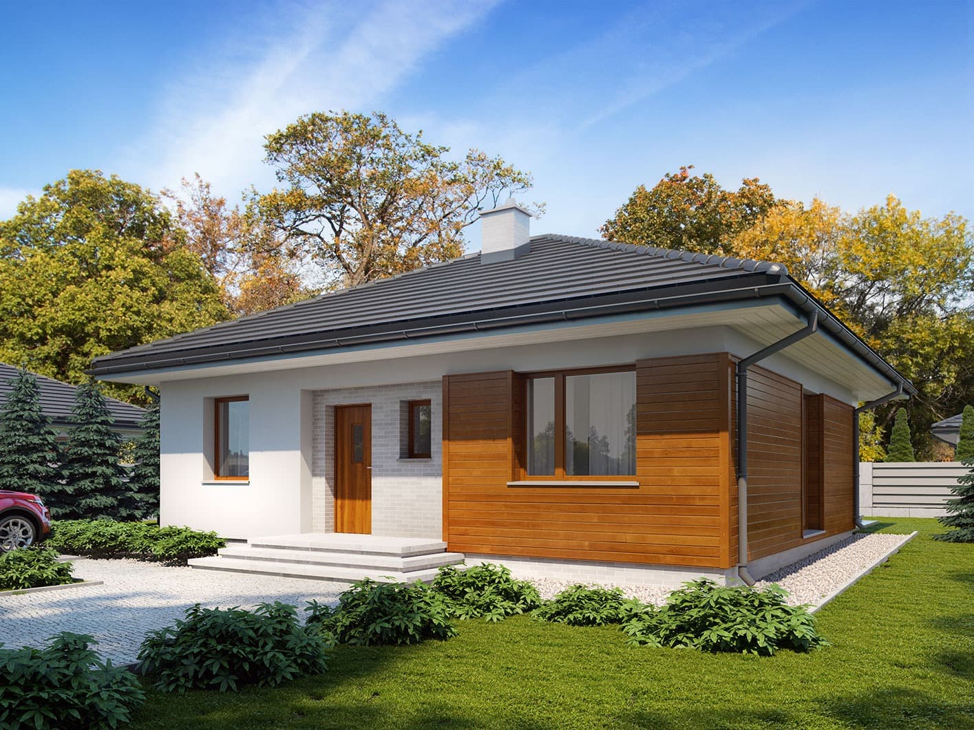 Elsa drewniana to projekt parterowego domu jednorodzinnego zapewniającego optymalne potrzeby 3-4-osobowej rodziny. Jest to dom bardzo funkcjonalny z wyraźnym podziałem na strefy. Przestronna część dzienna to proste i klasyczne połączenie salonu, jadalni i kuchni, zaś strefa intymna składa się z 2 sypialni i łazienki. Plusem projektu jest dodatkowe pomieszczenie gospodarcze, które można przeznaczyć na pralnię lub spiżarnię. Dom posiada duży taras umożliwiający spędzanie czasu na świeżym powietrzu niezależnie od warunków pogodowych. Wejście do domu jest przez niewielki podcień chroniący przed deszczem i słońcem. Z samego wiatrołapu prowadzi wejście do dużej kotłowni na każdy rodzaj paliwa. Bryła budynku zamknięta jest na rzucie kwadratu, przykrytego czterospadowym dachem. Taka forma budynku czyni go prostym w budowie i tanim w eksploatacji.