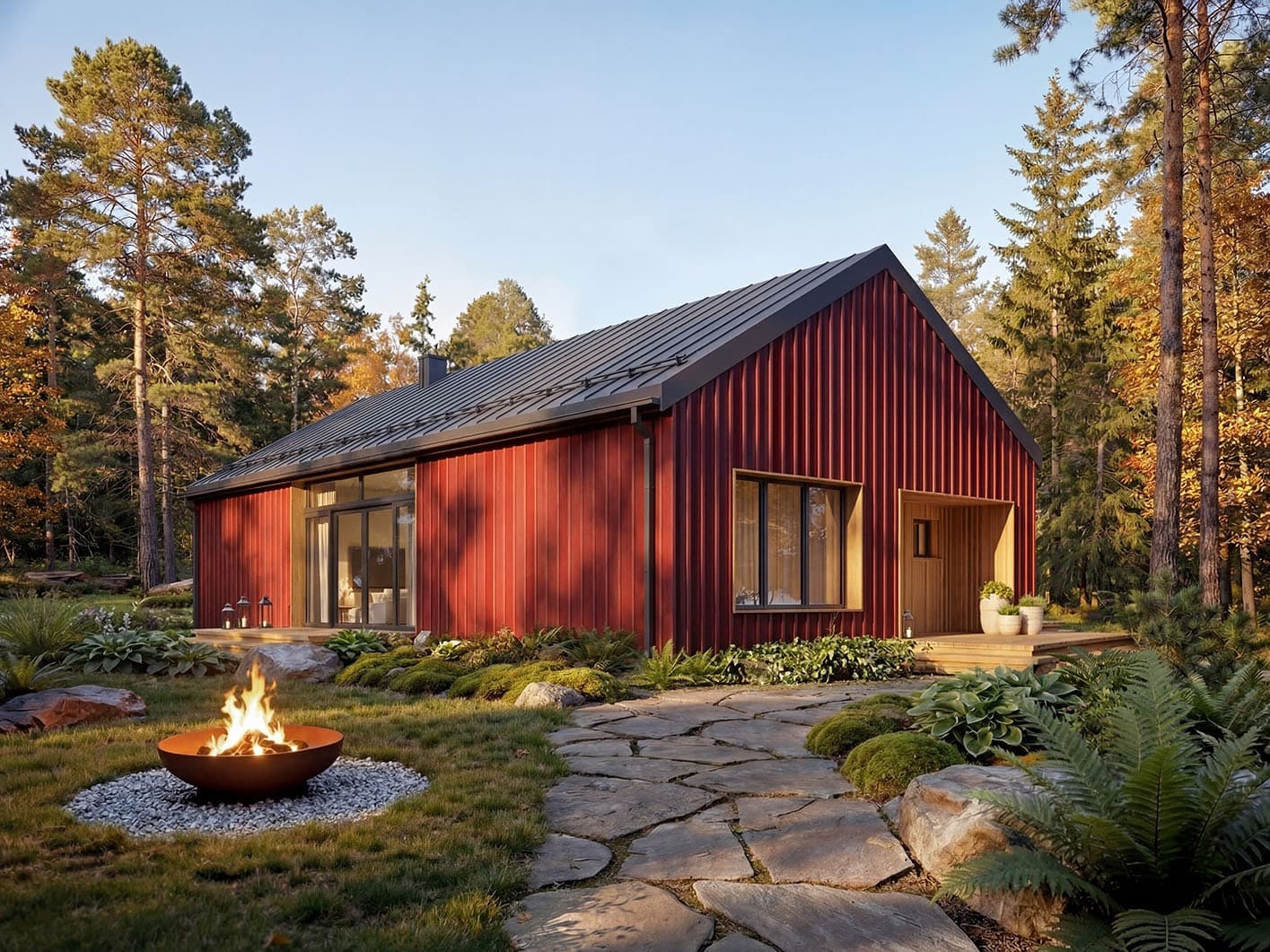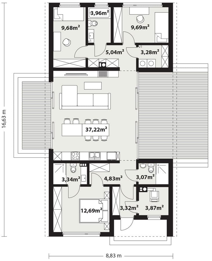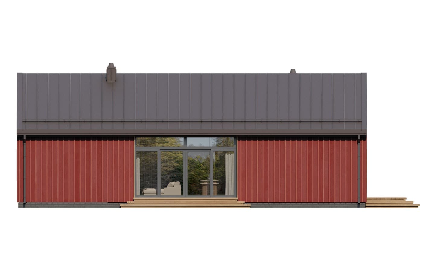 Mati drewniany to parterowy dom jednorodzinny w stylu nowoczesnej stodoły o bardzo ciekawej architekturze. Jego centralnym punktem jest całkowicie przeszklona część dzienna. Rozbija ona tę prostą bryłę na rzucie prostokąta przykrytego dwuspadowym dachem. Przestrzeń dzienna nie tylko pozwala na szereg aranżacji wnętrza ale umożliwia także na przenikanie poprzez przeszklenia i tarasy, otaczającej przyrody. Mimo tak ciekawej części dziennej dom charakteryzuje się prostym, funkcjonalnym układem pomieszczeń, który swoim programem zapewnia optymalny komfort 4-osobowej rodzinie. Od frontu budynku przewidziano wiatrołap i hol, kotłownię, łazienkę oraz sypialnię rodziców z łazienką. W strefie nocnej po drugiej stronie budynku zaprojektowano dwie sypialnie dzieci, łazienkę, pralnię oraz długi korytarz z szeregiem szaf. Bryła jest zaprojektowana w ciekawej kolorystyce czerwonego drewna przełamanego szalówką w naturalnym kolorze. W domu Mati drewniany idealnie połączono prostą, bryłę z przyciągającym uwagę otwarciem w części dziennej, co może się spodobać zarówno inwestorom poszukującym domu bardziej klasycznego jak i tym otwartym na współczesne spojrzenie na architekturę.