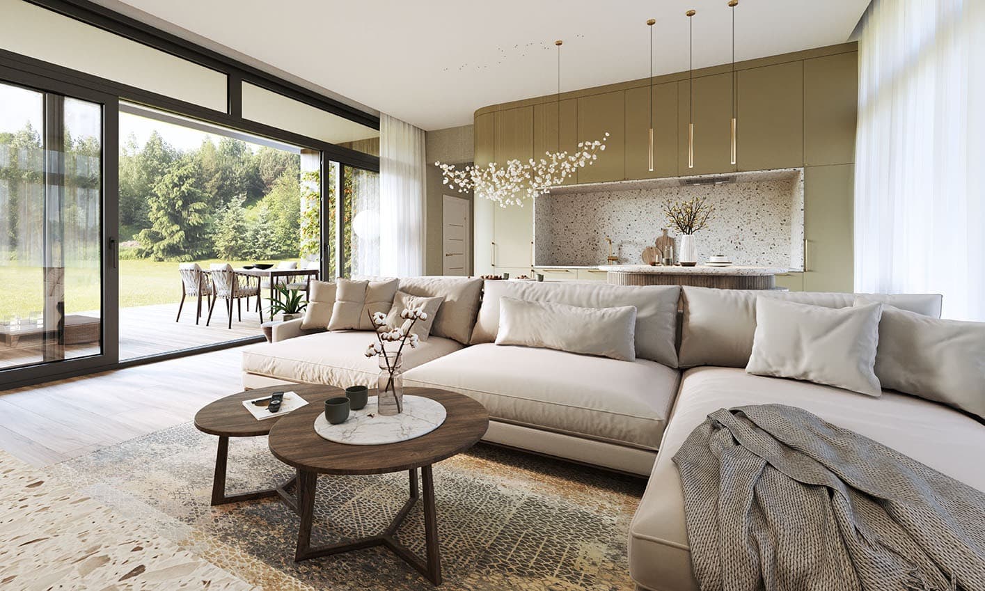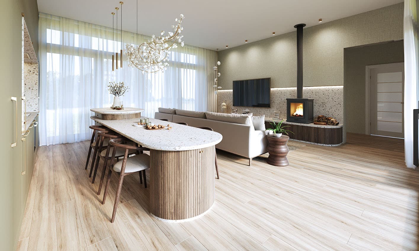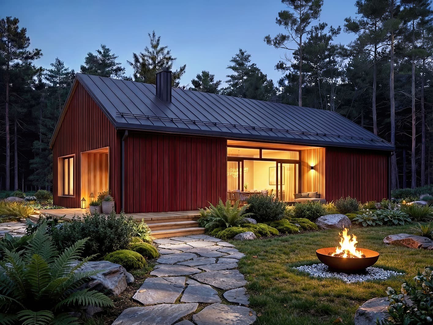 Mati drewniany to parterowy dom jednorodzinny w stylu nowoczesnej stodoły o bardzo ciekawej architekturze. Jego centralnym punktem jest całkowicie przeszklona część dzienna. Rozbija ona tę prostą bryłę na rzucie prostokąta przykrytego dwuspadowym dachem. Przestrzeń dzienna nie tylko pozwala na szereg aranżacji wnętrza ale umożliwia także na przenikanie poprzez przeszklenia i tarasy, otaczającej przyrody. Mimo tak ciekawej części dziennej dom charakteryzuje się prostym, funkcjonalnym układem pomieszczeń, który swoim programem zapewnia optymalny komfort 4-osobowej rodzinie. Od frontu budynku przewidziano wiatrołap i hol, kotłownię, łazienkę oraz sypialnię rodziców z łazienką. W strefie nocnej po drugiej stronie budynku zaprojektowano dwie sypialnie dzieci, łazienkę, pralnię oraz długi korytarz z szeregiem szaf. Bryła jest zaprojektowana w ciekawej kolorystyce czerwonego drewna przełamanego szalówką w naturalnym kolorze. W domu Mati drewniany idealnie połączono prostą, bryłę z przyciągającym uwagę otwarciem w części dziennej, co może się spodobać zarówno inwestorom poszukującym domu bardziej klasycznego jak i tym otwartym na współczesne spojrzenie na architekturę.