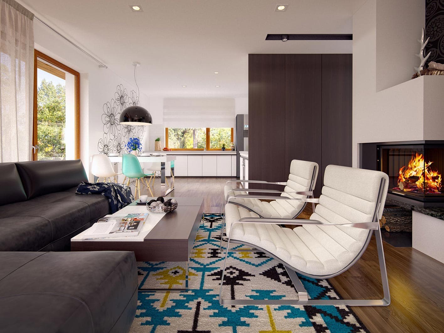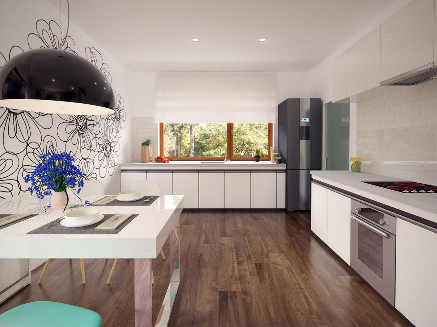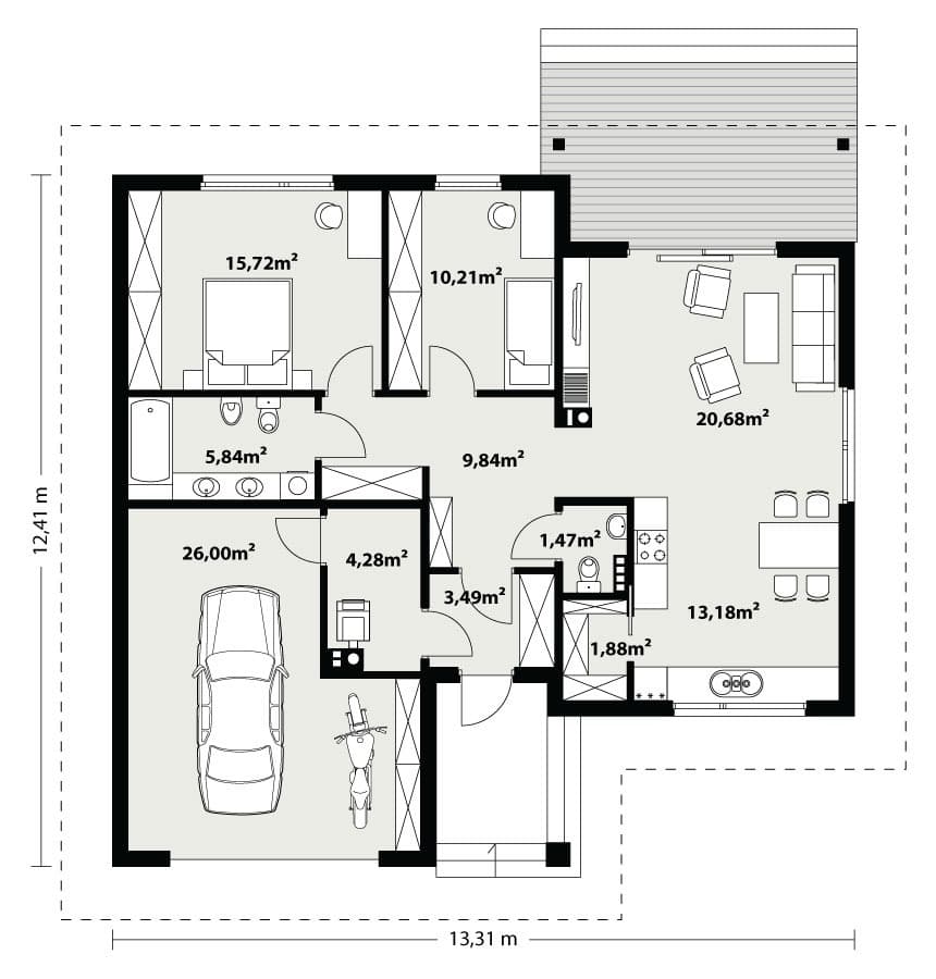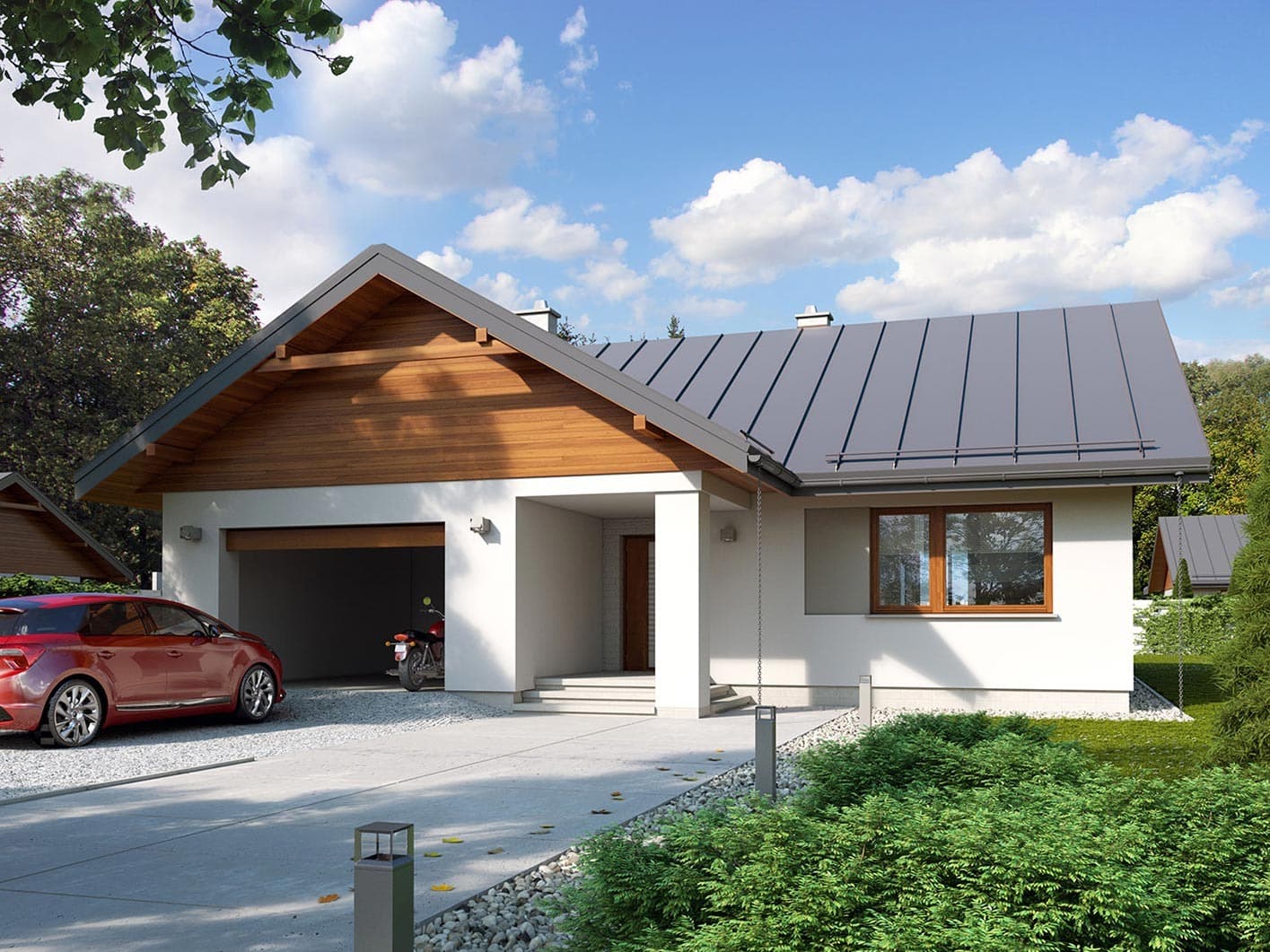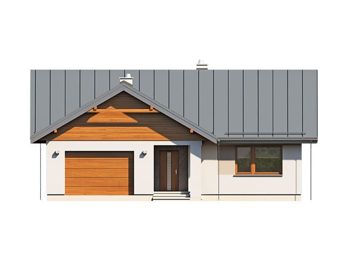Niko drewniany to niewielki dom, prosty, funkcjonalny i ekonomiczny w budowie. Jest to propozycja dla osób, które marzą o małym, ale własnym domu. Ten urokliwy dom mieszkalny w technologii szkieletu drewnianego przeznaczony jest dla 3-4 osobowej rodziny. Zaletą tego projektu jest jego program funkcjonalny ujęty w niewielkiej powierzchni użytkowej. Wnętrze zostało rozplanowane w sposób przemyślany, z dbałością o maksymalne wykorzystanie przestrzeni domu. Część reprezentacyjna, to przestronny salon połączony z jadalnią, który otwiera się na duży, zadaszony taras oraz kuchnia ze spiżarnią. Oprócz części dziennej, przewidziano strefę intymną domu, która składa się z dwóch sypialni i łazienki. Dużą kotłownię oraz garaż zaprojektowano w części gospodarczej domu. Wymiary kotłowni umożliwiają montaż kotła na każdy rodzaj paliwa natomiast ciekawie zaprojektowaną wnękę w garażu można wykorzystać jako skład opału bądź pomieszczenie gospodarcze. Niko drewniany stanowi idealne połączenie tradycyjnej bryły z nowoczesnym elewacjami. Geometria rzutu oraz prostota bryły czynią ten dom tanim i prostym w budowie. Jest to idealna propozycja dla rodziny, która ma na uwadze późniejsze koszty utrzymania i eksploatacji domu.