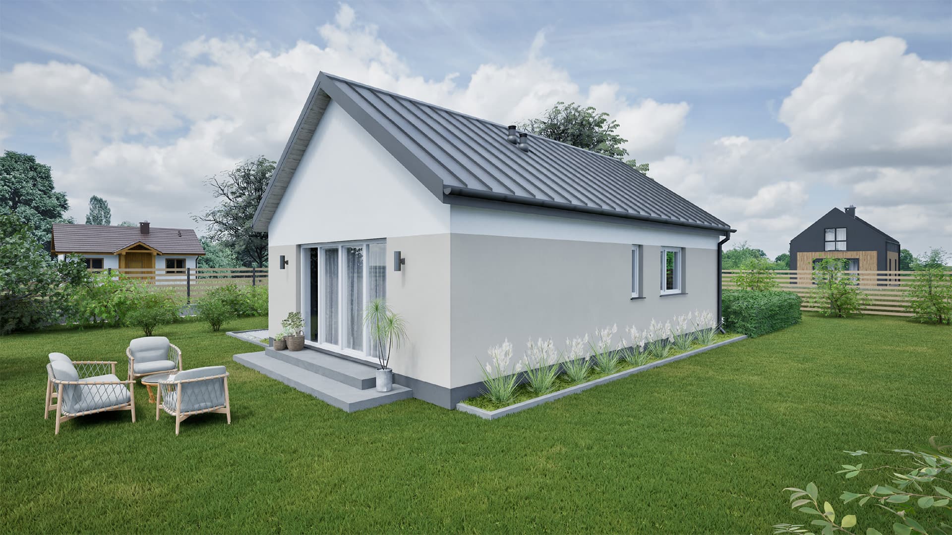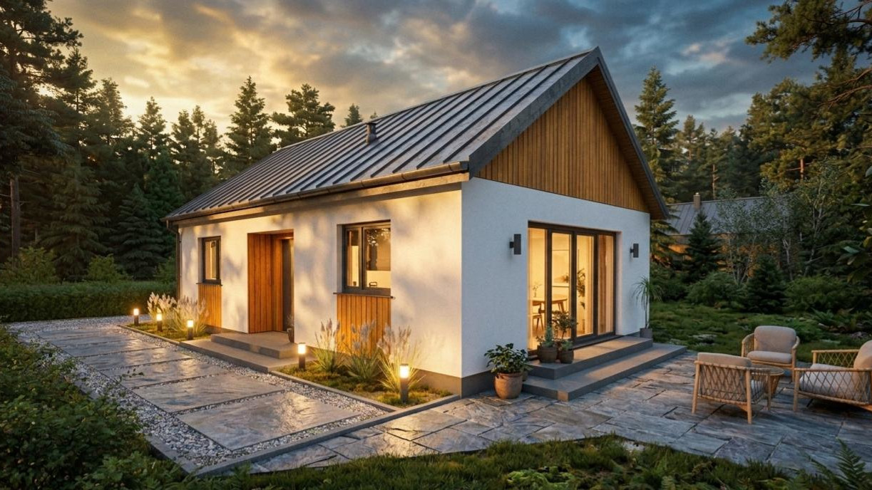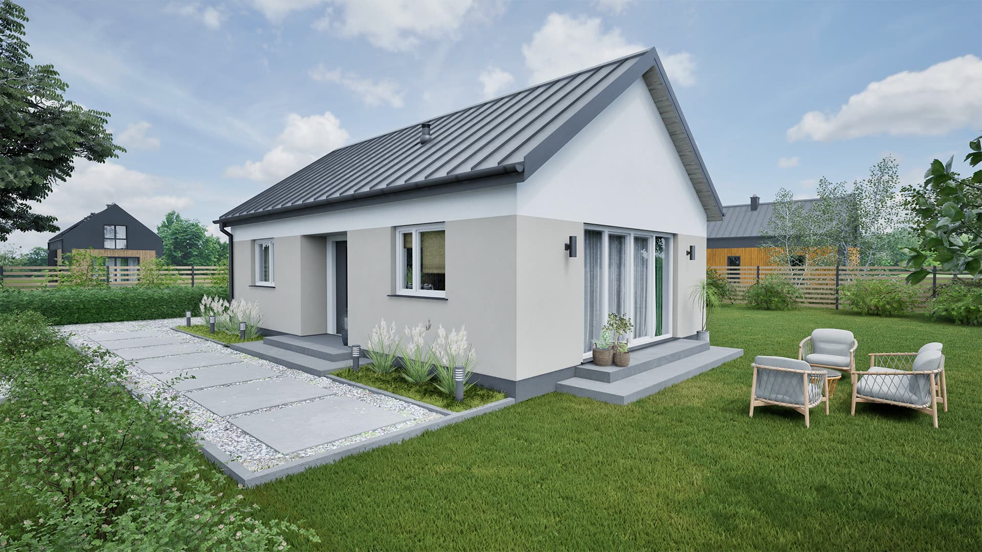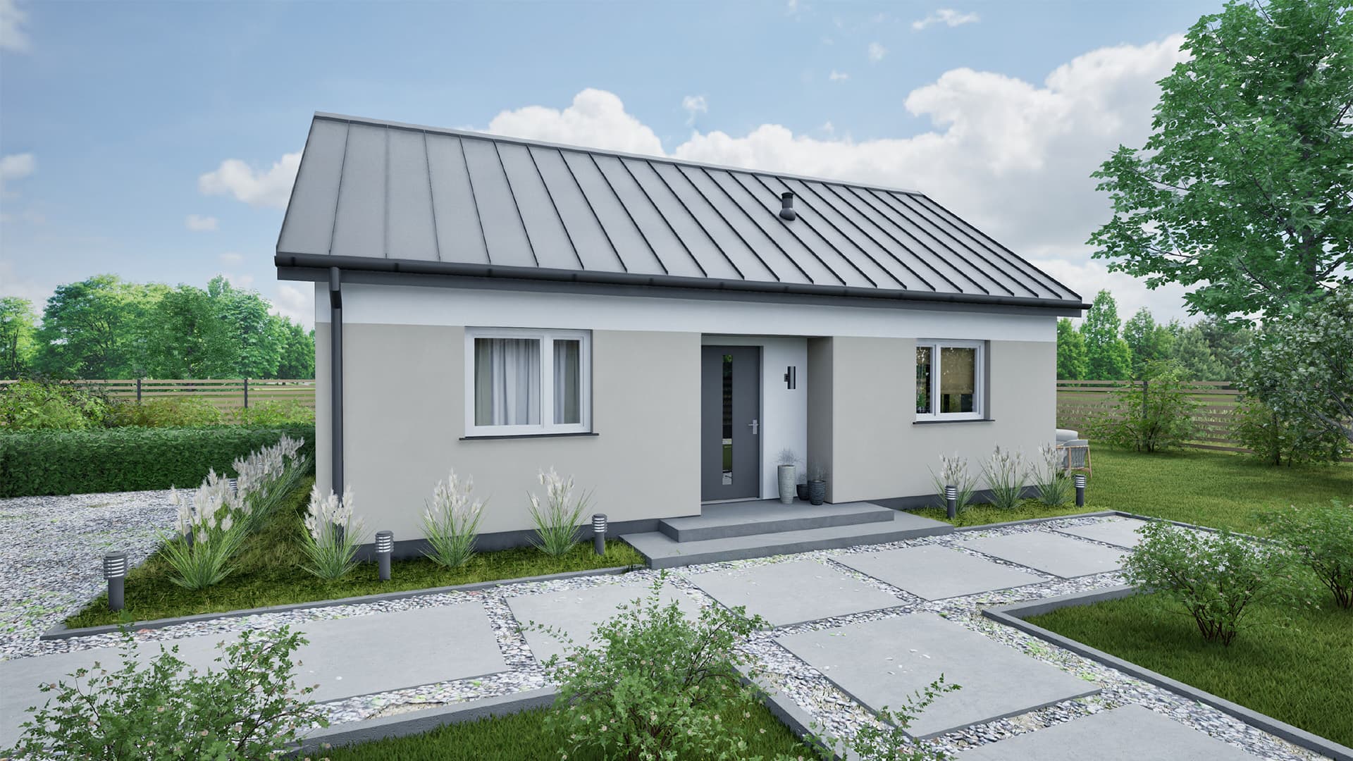 Dom o harmonijnej, nowoczesnej bryle i przemyślanym, funkcjonalnym układzie wnętrza. Część dzienna parteru składa się z salonu ze strefą jadalną, połączonego z widną, funkcjonalną kuchnią. Szerokie wyjście na taras potęguje efekt przestronności. Część prywatna to dwie przestronne i ustawne sypialnie z wnękami na szafy. Walorów funkcjonalności dopełnia widna, przestronna łazienka, a także – w wariancie 2 – dodatkowe pomieszczenie techniczne z funkcją pralni.
