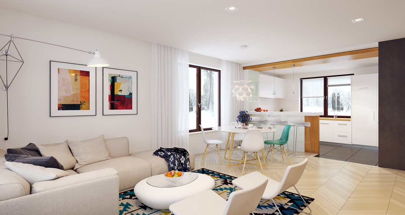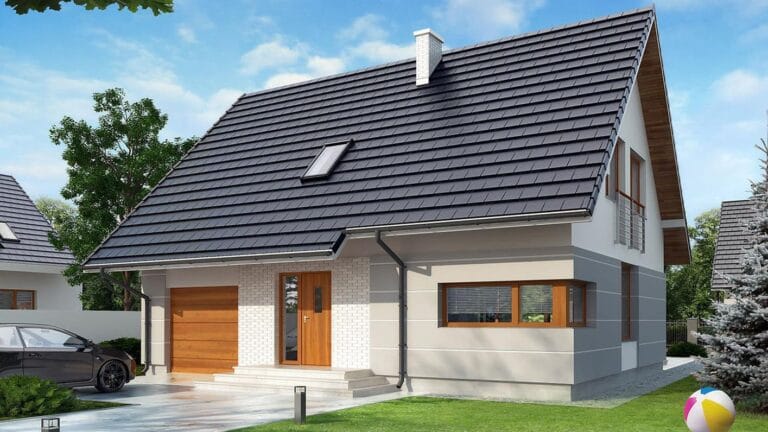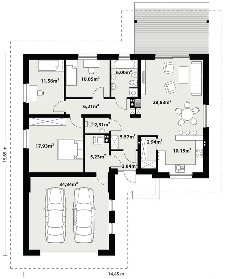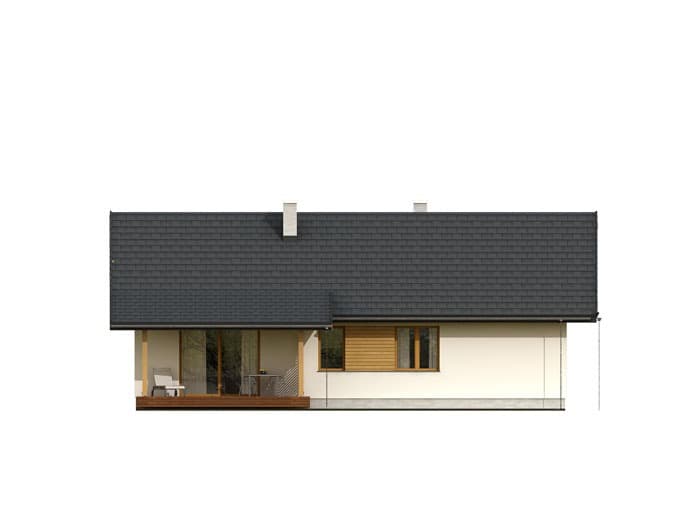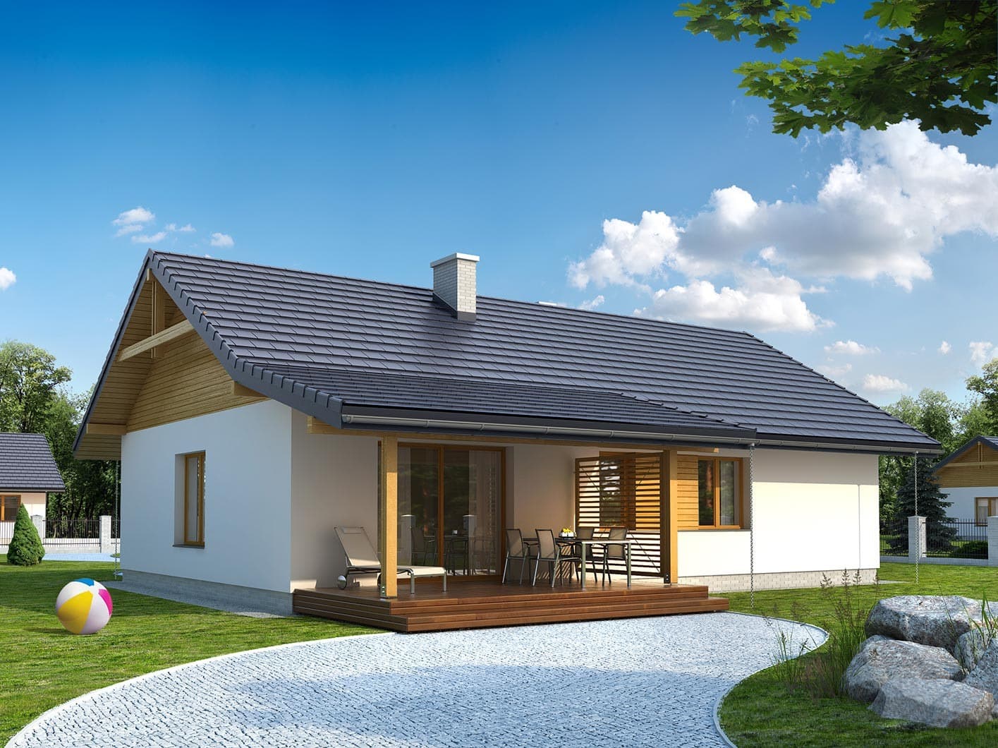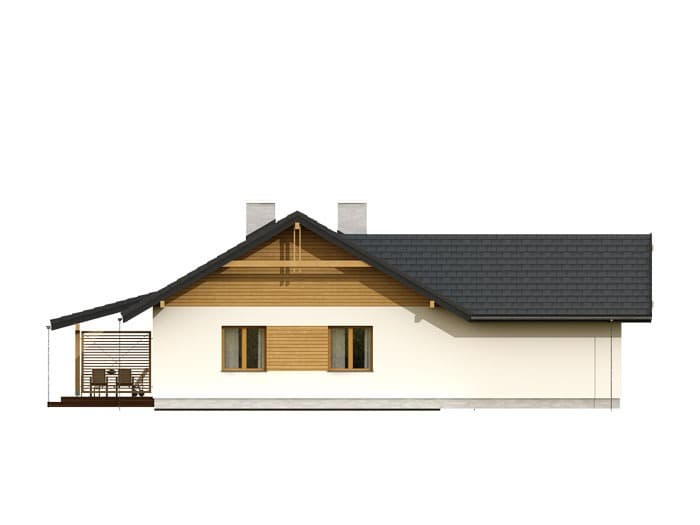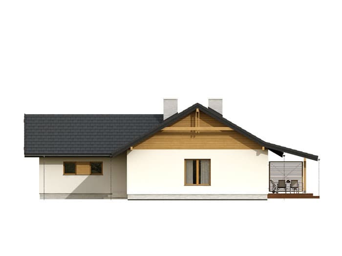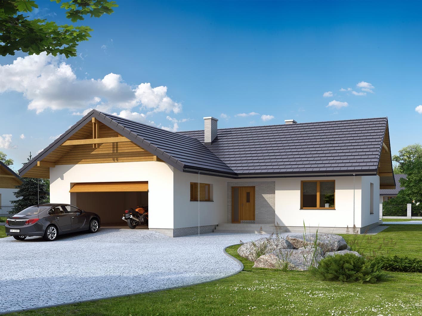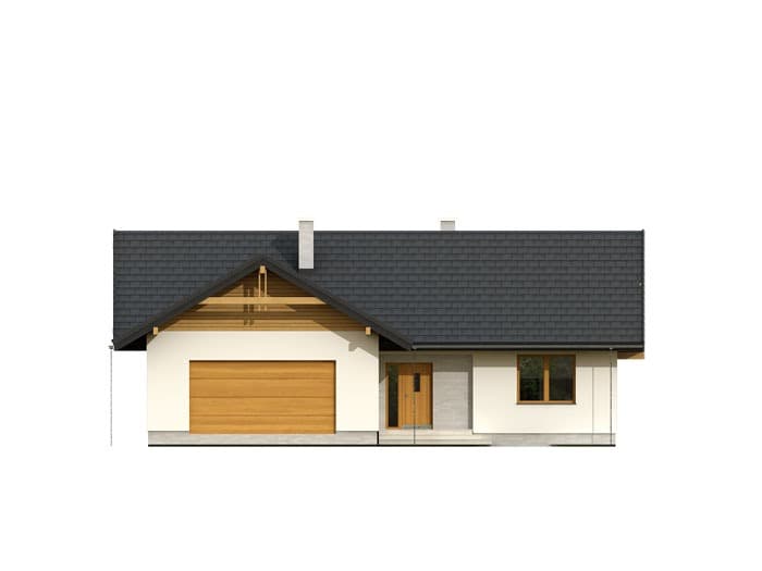Dom jednorodzinny, parterowy, niepodpiwniczony, z dwustanowiskowym garażem. Wygodny, funkcjonalny, z optymalnie rozplanowaną przestrzenią. Przestronny salon połączony z kuchnią otwiera się na duży, zadaszony taras. Posiada spiżarnię dostępną z kuchni oraz kotłownię z możliwością zastosowania kotła na paliwo stałe. Dom jest tani i prosty w budowie a przez zastosowanie rozwiązań energooszczędnych również niedrogi w utrzymaniu.