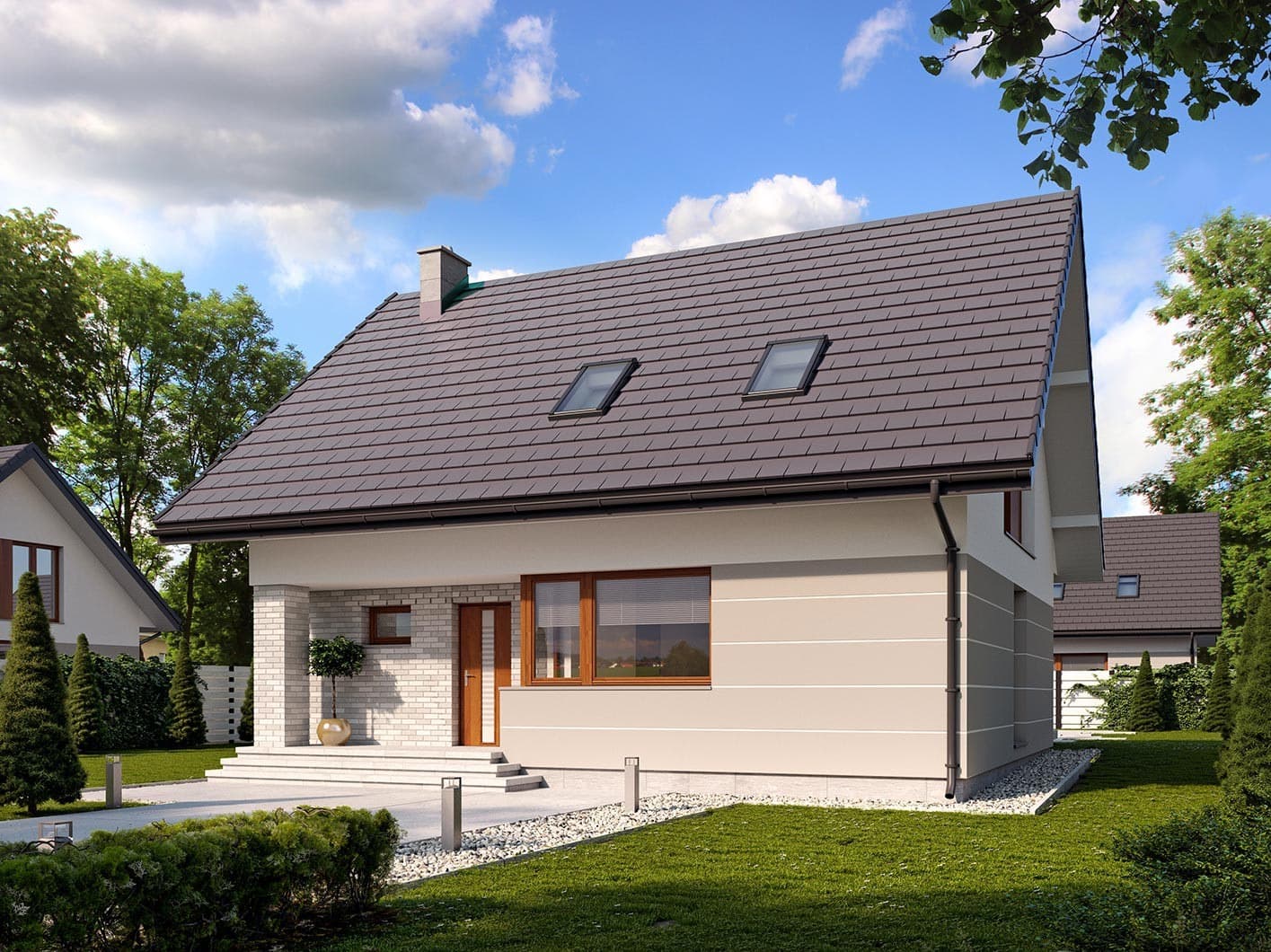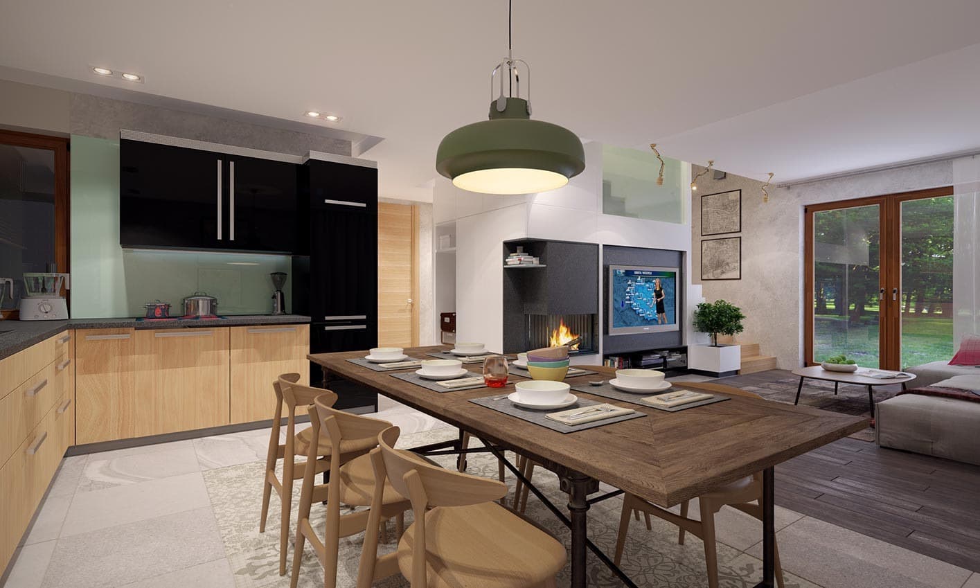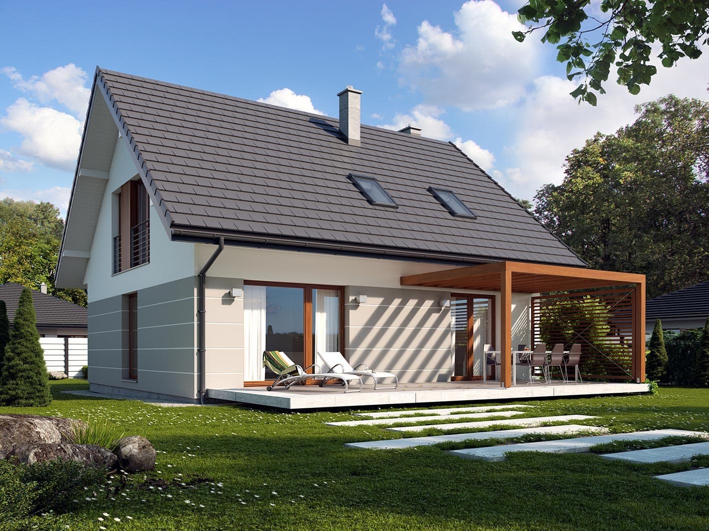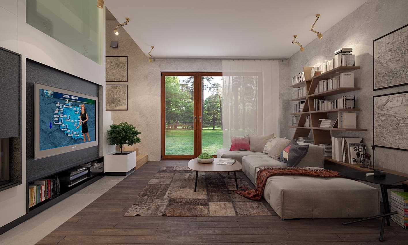 Prosty, ale zarazem interesujący dom o niewielkich gabarytach. Bardzo funkcjonalny układ pomieszczeń zapewnia optymalny komfort 4-osobowej rodzinie. Na parterze zaprojektowano kuchnię połączoną z jadalnią i salonem, kotłownię, łazienkę oraz dodatkowy pokój. Na poddaszu przewidziano 3 sypialnie oraz łazienkę. Elegancki styl tego budynku uzyskano poprzez połączenie klasycznej bryły domu jednorodzinnego z nowoczesnymi elewacjami i materiałami.