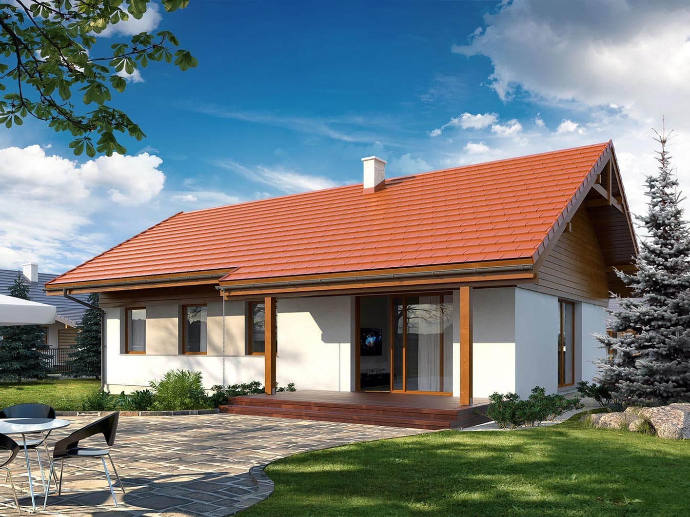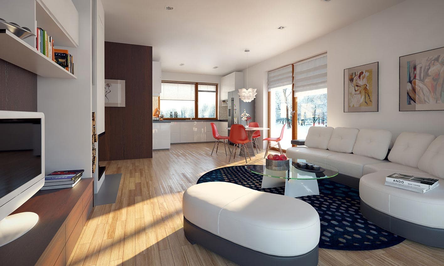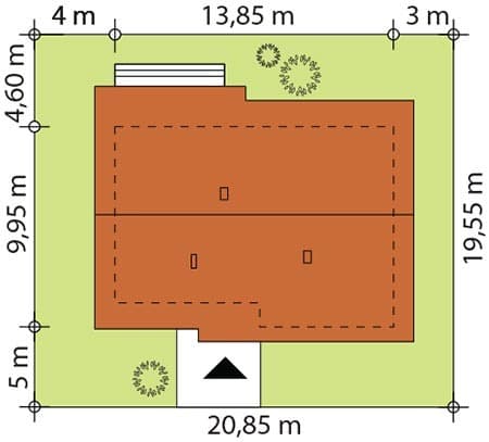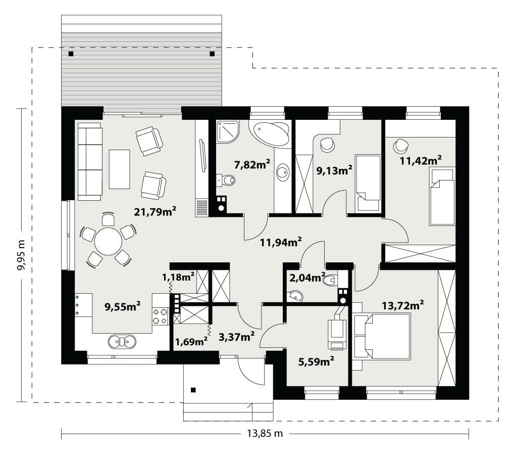 Niewielki jednorodzinny budynek mieszkalny, parterowy, niepodpiwniczony. W swojej niewielkiej formie zawarł wygodny i optymalny układ pomieszczeń, który zapewni komfort 4-osobowej rodzinie. Funkcjonalnie rozplanowana przestrzeń została wyraźnie podzielona na część dzienną i nocną. Część reprezentacyjna domu, to przestronny salon połączony z jadalnią, który otwiera się na duży zadaszony taras, kuchnia wzbogacona o spiżarnię. Oprócz części reprezentacyjnej, zaprojektowano trzy sypialnie i dużą łazienkę stanowiącą cześć intymną domu, oraz dużą kotłownię w części gospodarczej. Wymiary kotłowni umożliwiają montaż kotła na każdy rodzaj paliwa, w tym na paliwo stałe. Sama bryła budynku nawiązuje do archetypu domu jednorodzinnego. Rzut budynku powstał w oparciu o rzut prostokąta, zaś sam dom został przykryty dachem dwuspadowym. Dom tym samym jest tani i prosty w budowie oraz niedrogi w utrzymaniu i eksploatacji.