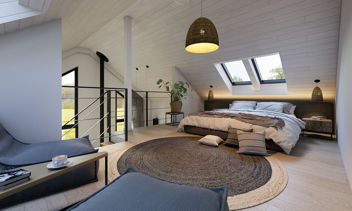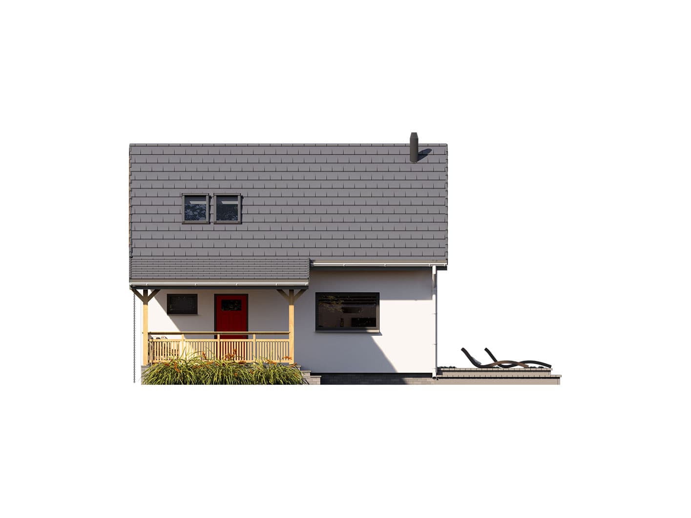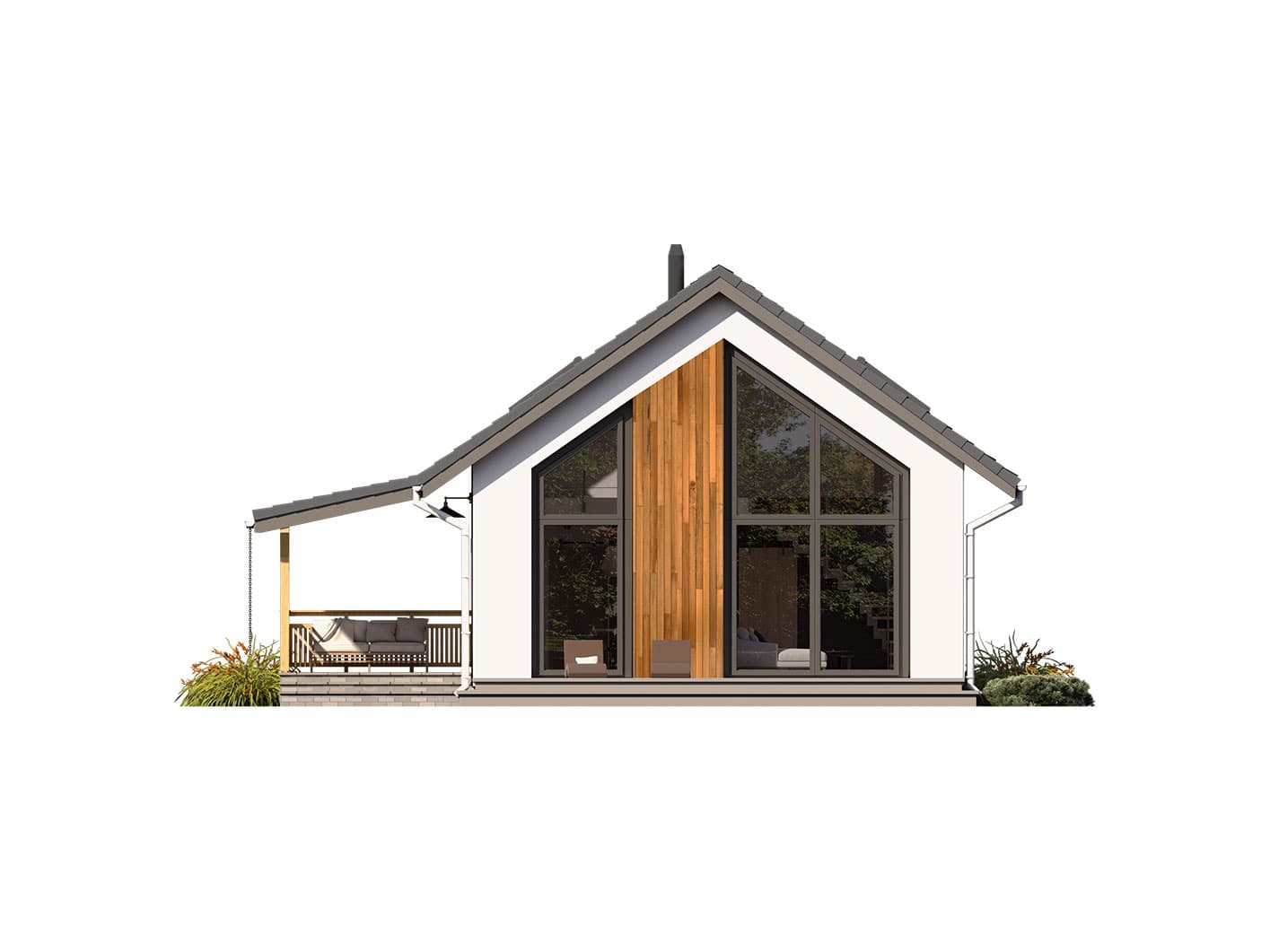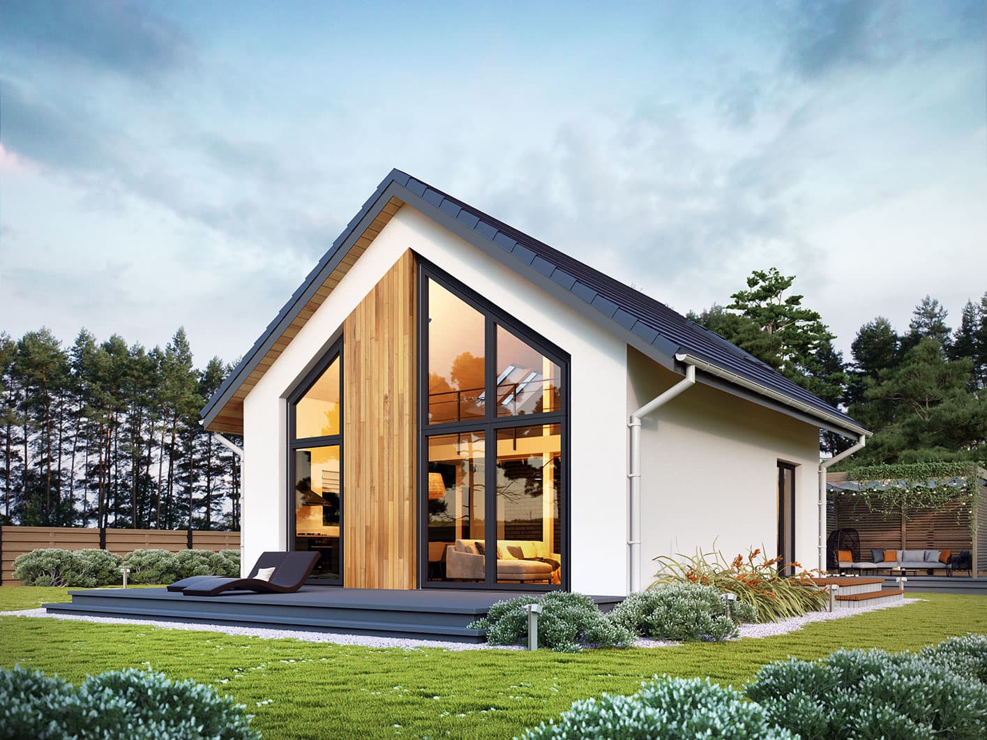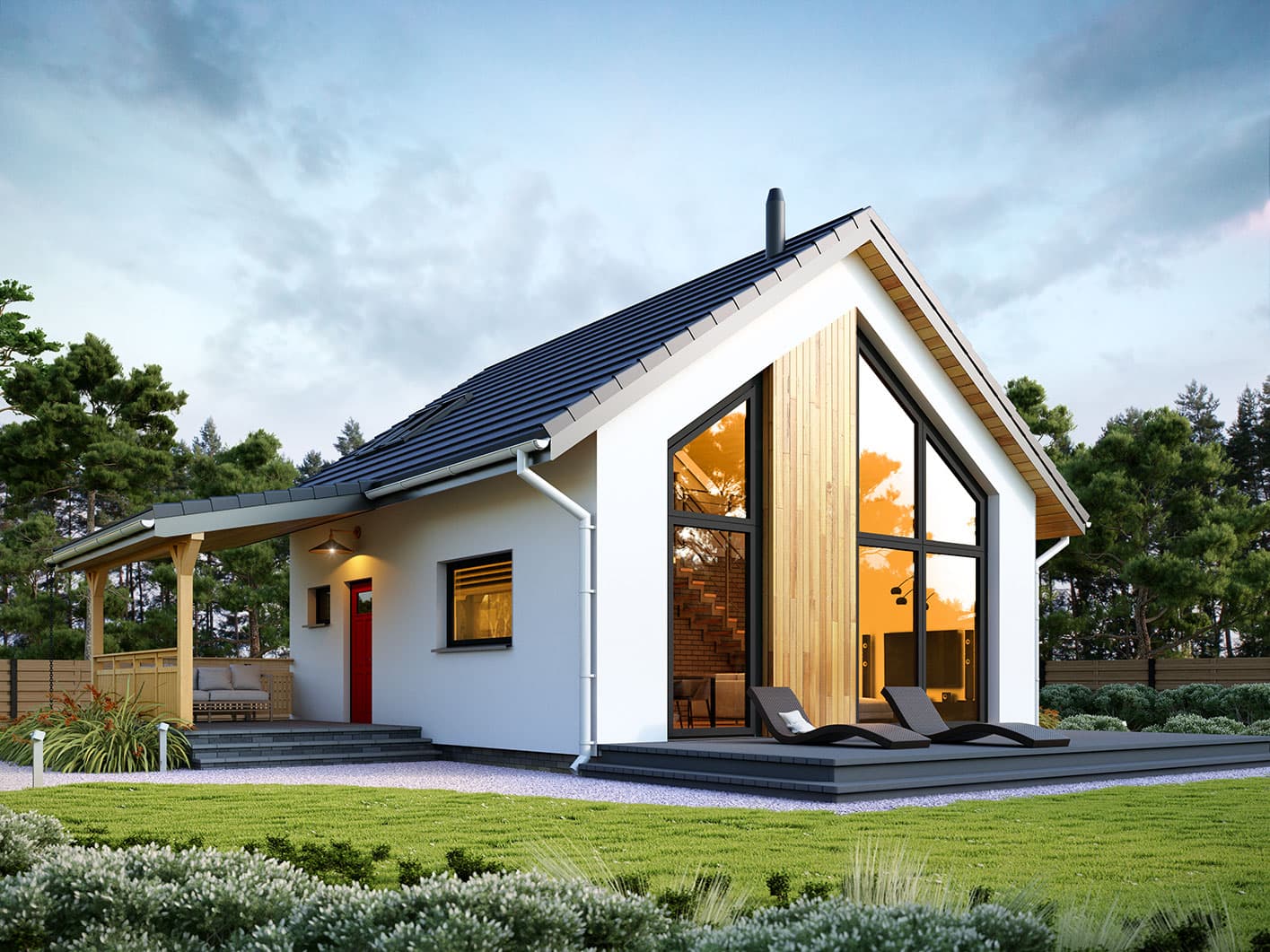 Erna 3 to niewielki dom jednorodzinny lub letniskowy. Posiada sypialnię na parterze oraz otwartą część dzienną z antresolą na której jest dodatkowa przestrzeń do dowolnej aranżacji. Dzięki powierzchni zabudowy 69,5 m2, może być budowany na zgłoszenie. Dom posiada duże przeszklenie w ścianie szczytowej a wejście jest przez zadaszony taras z boku domu co pozwala sytuować dom również na działkach z wejściem od południa. Standardowo dom wyposażony jest w pompę ciepła oraz kominek.