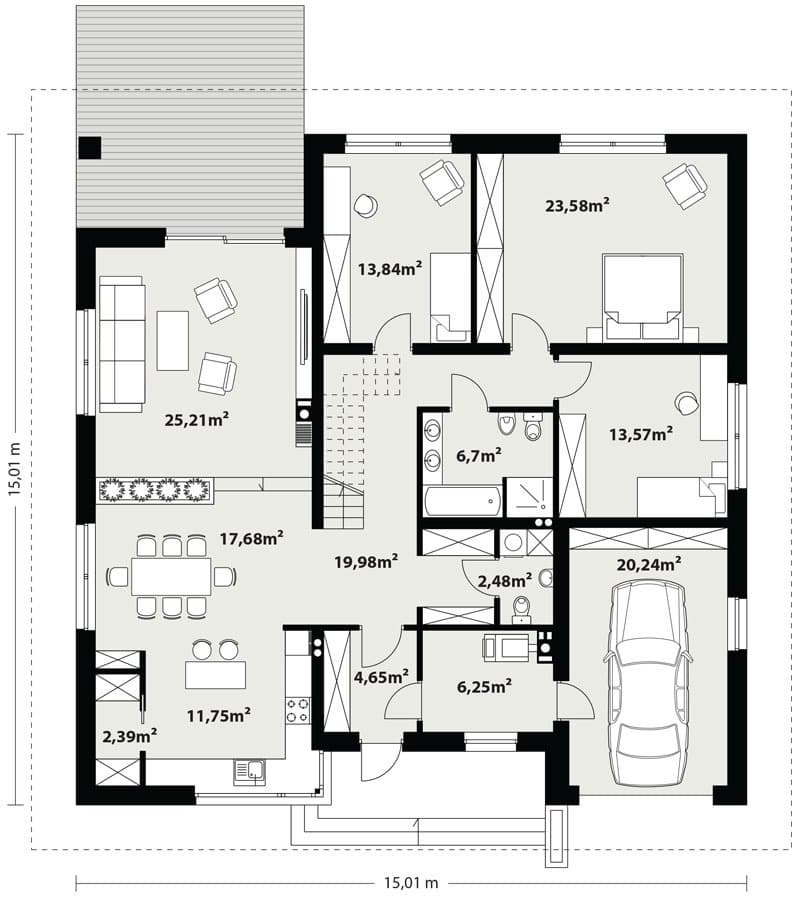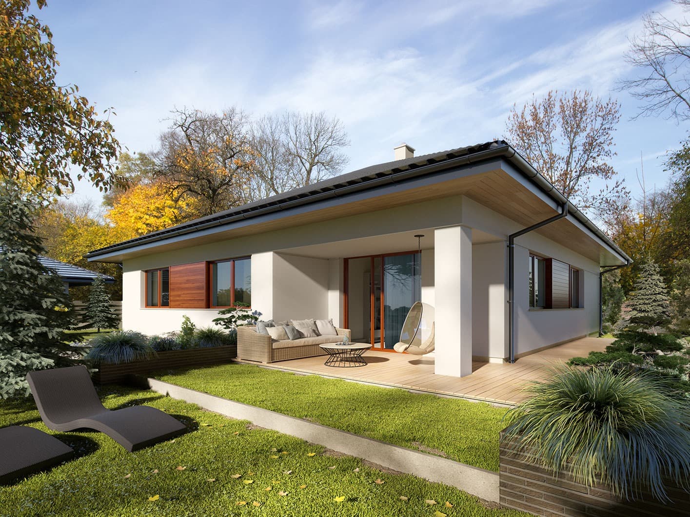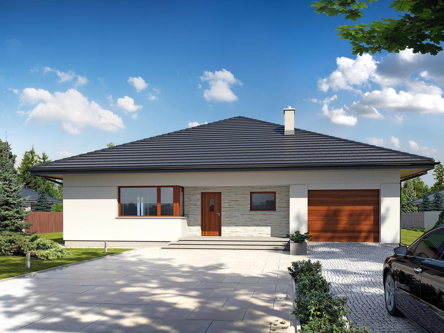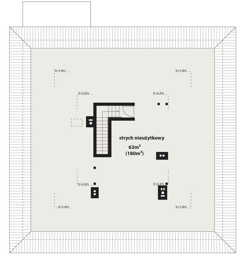 Dom jednorodzinny, parterowy, z garażem jednostanowiskowym. Wygodny i przestronny. Kuchnia posiada spiżarnię oraz wyposażona została w duże okno z widokiem na schody wejściowe. Duża jadalnia od kuchni oddzielona została barem. Salon ma wysokość 2,98 m przez obniżenie poziomu posadzki względem reszty domu. Posiada też duże przeszklone wyjście na zadaszony taras. W domu tym przewidziano miejsce na schody prowadzące na strych, który można dowolnie zagospodarować (nieujęty do powierzchni użytkowej). Kotłownia pozwala na zastosowanie kotła na dowolny rodzaj paliwa, a przez przesunięcie ścian działowych można ją powiększyć kosztem holu i wc.