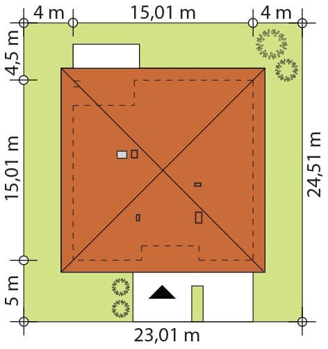 Dach: dachówka lub blachodachówka Elewacje: tynk Strop: żelbetowy Ściany wewnętrzne: murowane Ściany zewnętrzne: dwuwarstwowe, pustak ceramiczny 25 cm, docieplony styropianem 18 cm