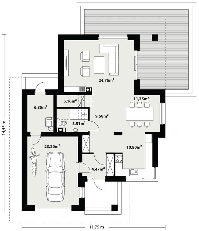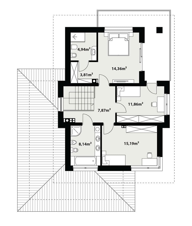 Karat 3, to projekt eleganckiego, nowoczesnego domu piętrowego przeznaczonego dla 4-osobowej rodziny. Jest to typowo miejska rezydencja o reprezentacyjnym wyglądzie i optymalnej powierzchni użytkowej. Posiada bogaty program fukncjonalny, rozłożony na dwóch pełnych kondygnacyjnych, który zapewni komfort wymagającym inwestorom. Parter zaprojektowano jako otwartą przestrzeń dzienną, złożoną z połączonego salonu, jadalni i kuchni. Na parterze znajduje się również duża kotłownia, na każdy rodzaj paliwa oraz garaż o szerokości 1,5 miejsca postojowego. Na piętrze zaprojektowano 3 sypialnie i łazienkę. Główna sypialnia ma zapewnioną własną garderobę oraz łazienkę. Taką dodatkową przestrzeń można według potrzeb przerobić np. na kącik do pracy. Karat 3 zachwyca ciekawą, ponadczasową, klasyczną bryłą ujętą we współczesny elegancki wizerunek. Rezydencja ta stanowi doskonałą propozycję dla inwestorów poszukujących komfortowego domu w estetycznym wydaniu.