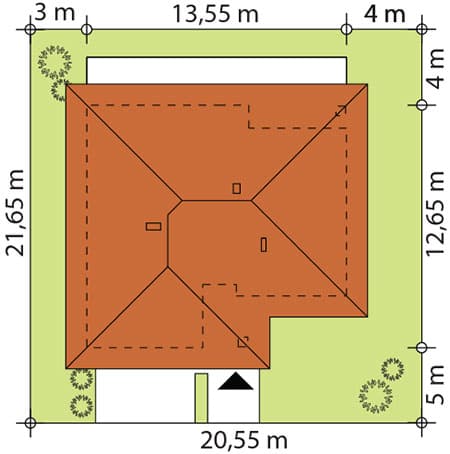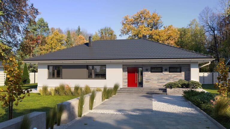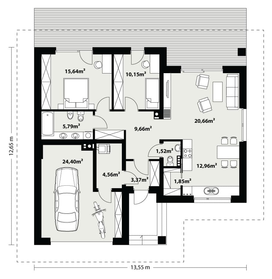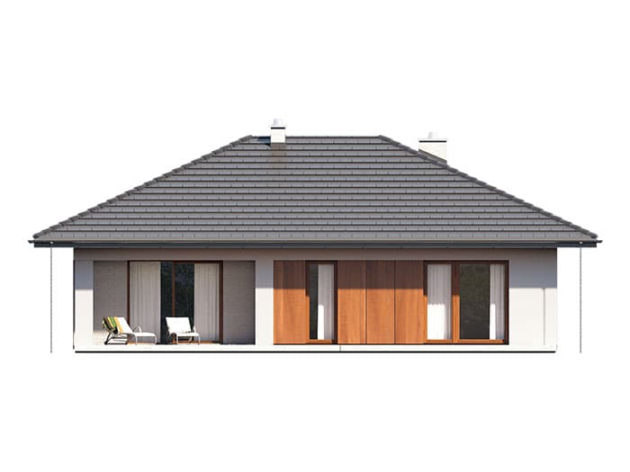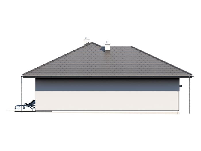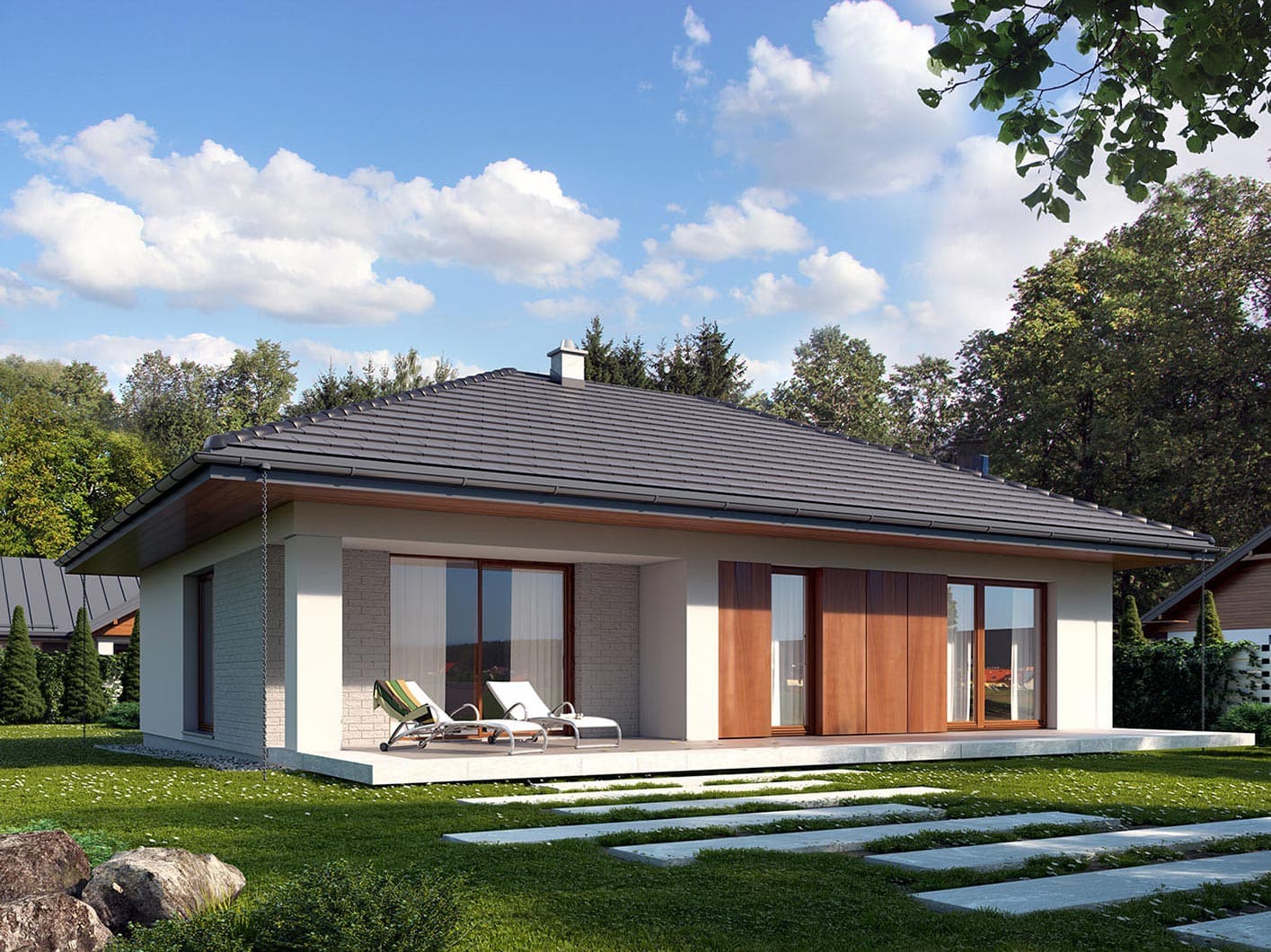 Nieduży jednorodzinny budynek mieszkalny, parterowy, z jednostanowiskowym garażem. Funkcjonalny układ pomieszczeń zapewnia optymalny komfort 3-osobowej rodzinie. Ergonomicznie zaprojektowana przestrzeń została wyraźnie podzielona na część dzienną, nocną i gospodarczą. Część reprezentacyjna domu, to przestronny salon połączony z jadalnią, który otwiera się na duży, zadaszony taras oraz kuchnia ze spiżarnią. Oprócz części dziennej, przewidziano strefę intymną domu, która składa się z dwóch sypialni i łazienki. Kotłownię oraz garaż zaprojektowano w części gospodarczej domu. Ciekawie zaprojektowaną wnękę w garażu można wykorzystać jako skład opału bądź pomieszczenie gospodarcze. Geometria rzutu oraz prostota bryły czynią ten dom tanim i prostym w budowie oraz niedrogim w utrzymaniu i eksploatacji.
