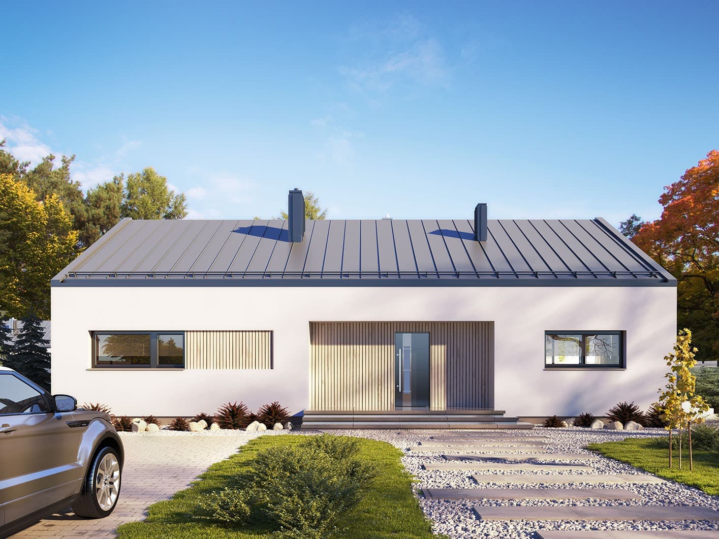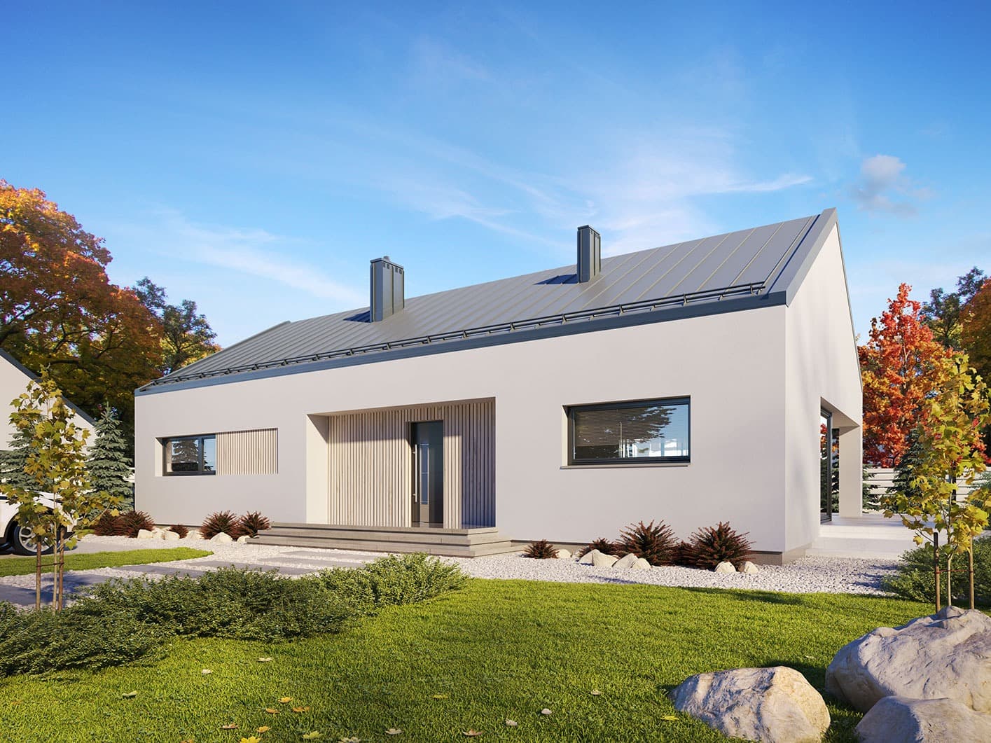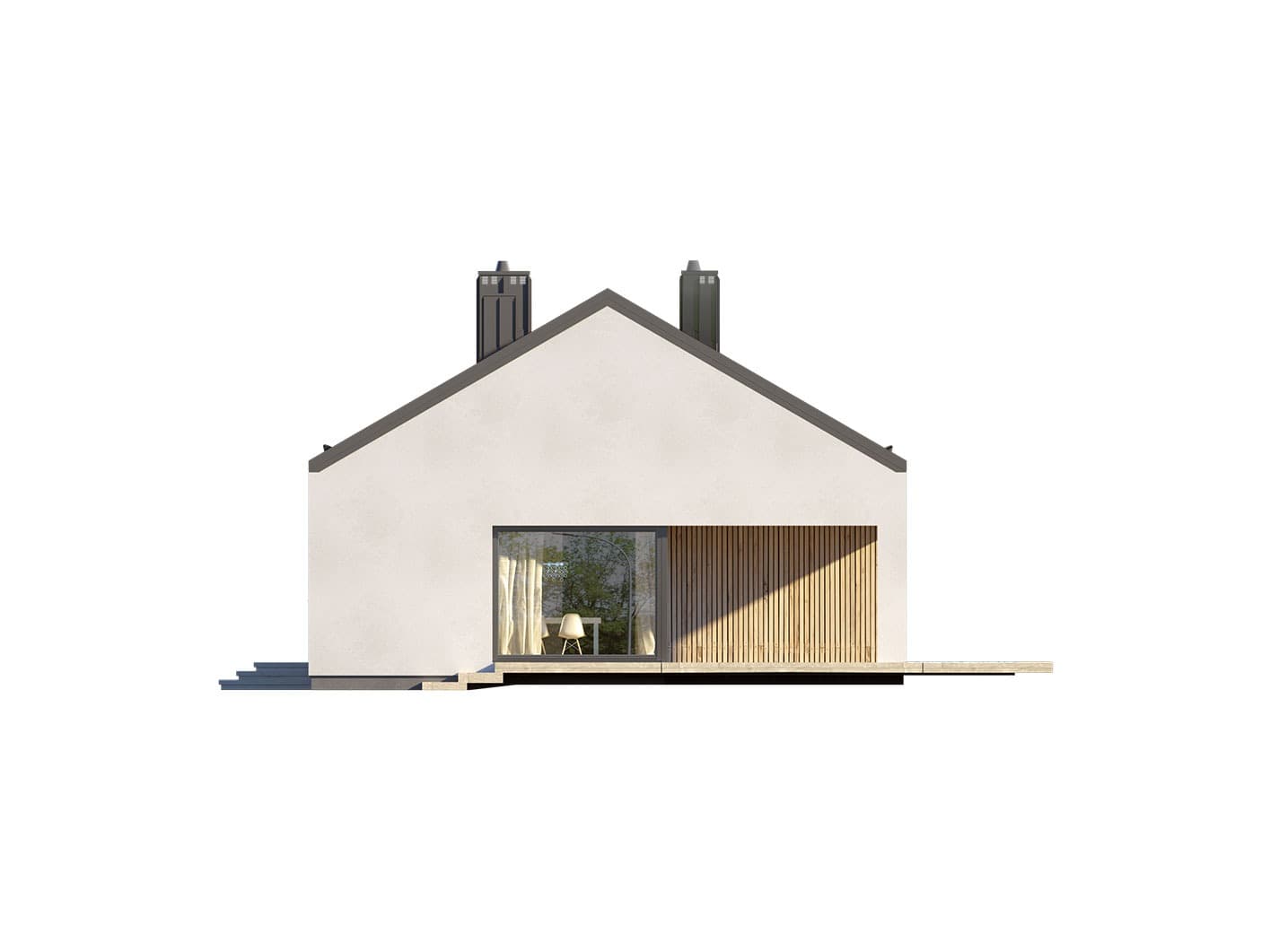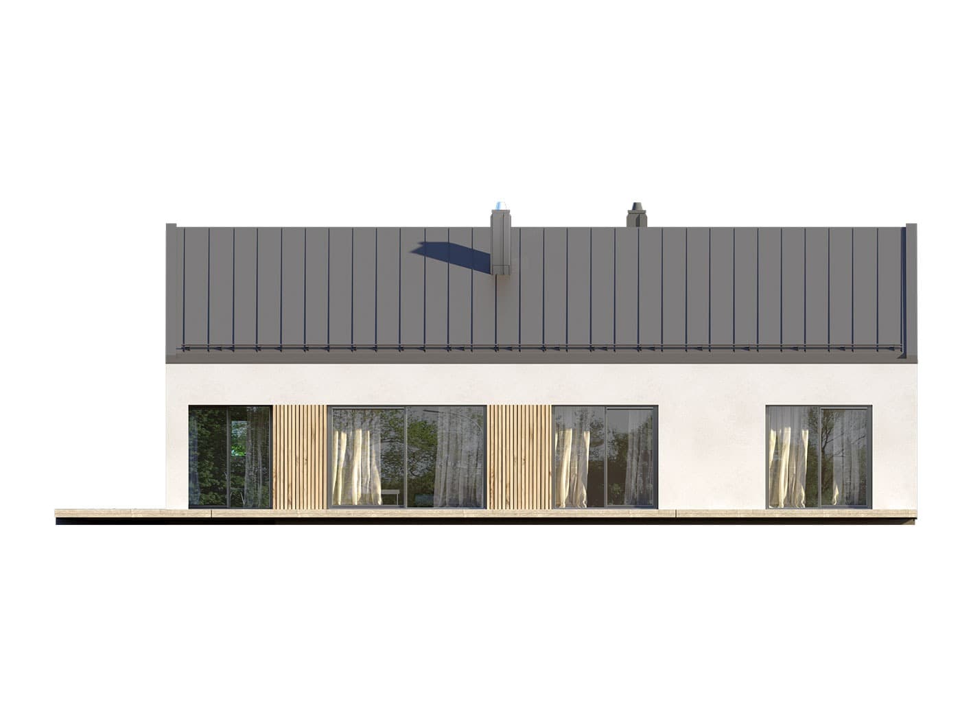 Projekt Semi to propozycja nowoczesnego domu parterowego. Poprzez układ na rzucie prostokąta, prostą bryłę przykrytą dwuspadowym dachem bez okapów oraz szereg przeszkleń obiekt utrzymany jest w stylistyce tzw. nowoczesnej stodoły. Współczesny, minimalistyczny charakter budynku uzyskano dzięki elewacjom wykończonym białym tynkiem, urozmaiconym szalówką w kolorze naturalnego drewna, które idealnie komponują się z szarą blachą na rąbek. Dom Semi, który kształtem nawiązuje do tradycyjnych wzorców typowych dla terenów wiejskich, we wnętrzu zachował bardzo przejrzysty i funkcjonalny program użytkowy dla 4 osobowej rodziny. Układ domu został podzielony na 3 strefy, gdzie część dzienna to salon oraz kuchnia ze spiżarnią i narożnie przeszkloną jadalnią. Strefa intymna składa się z 3 sypialni i łazienki. Część gospodarcza to duża kotłownia i pralnia. Niewątpliwym atutem projektu jest zastosowanie dużego tarasu oraz licznych przeszkleń zarówno w części dziennej, jak i w każdej z sypialni, co pozwala na otwarcie domu „na zewnątrz” i cieszenie się z pięknych, naturalnych walorów działki.