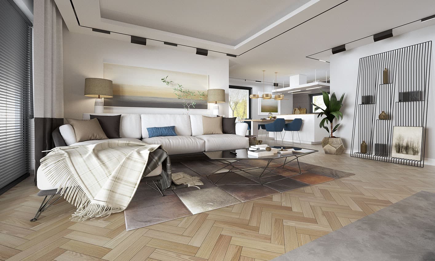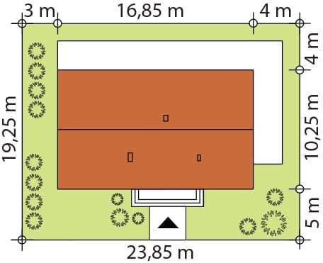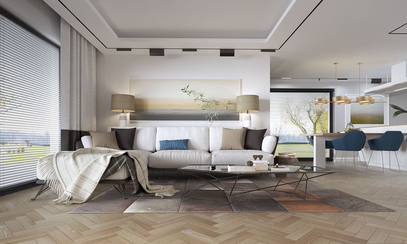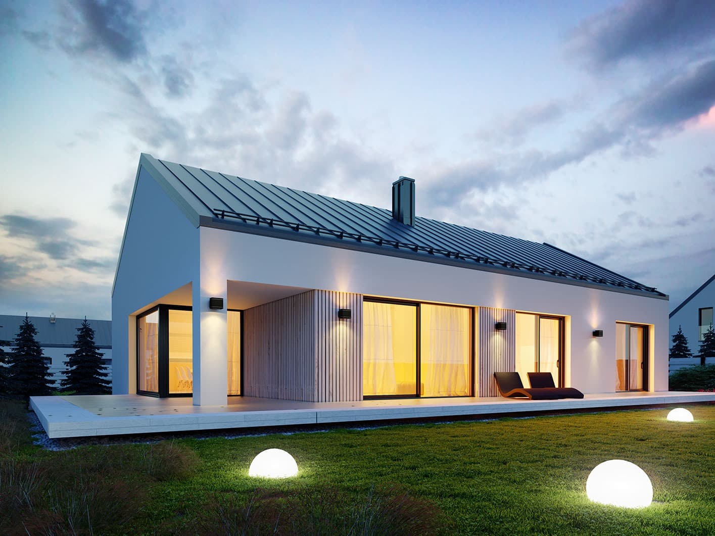 Projekt Semi to propozycja nowoczesnego domu parterowego. Poprzez układ na rzucie prostokąta, prostą bryłę przykrytą dwuspadowym dachem bez okapów oraz szereg przeszkleń obiekt utrzymany jest w stylistyce tzw. nowoczesnej stodoły. Współczesny, minimalistyczny charakter budynku uzyskano dzięki elewacjom wykończonym białym tynkiem, urozmaiconym szalówką w kolorze naturalnego drewna, które idealnie komponują się z szarą blachą na rąbek. Dom Semi, który kształtem nawiązuje do tradycyjnych wzorców typowych dla terenów wiejskich, we wnętrzu zachował bardzo przejrzysty i funkcjonalny program użytkowy dla 4 osobowej rodziny. Układ domu został podzielony na 3 strefy, gdzie część dzienna to salon oraz kuchnia ze spiżarnią i narożnie przeszkloną jadalnią. Strefa intymna składa się z 3 sypialni i łazienki. Część gospodarcza to duża kotłownia i pralnia. Niewątpliwym atutem projektu jest zastosowanie dużego tarasu oraz licznych przeszkleń zarówno w części dziennej, jak i w każdej z sypialni, co pozwala na otwarcie domu „na zewnątrz” i cieszenie się z pięknych, naturalnych walorów działki.