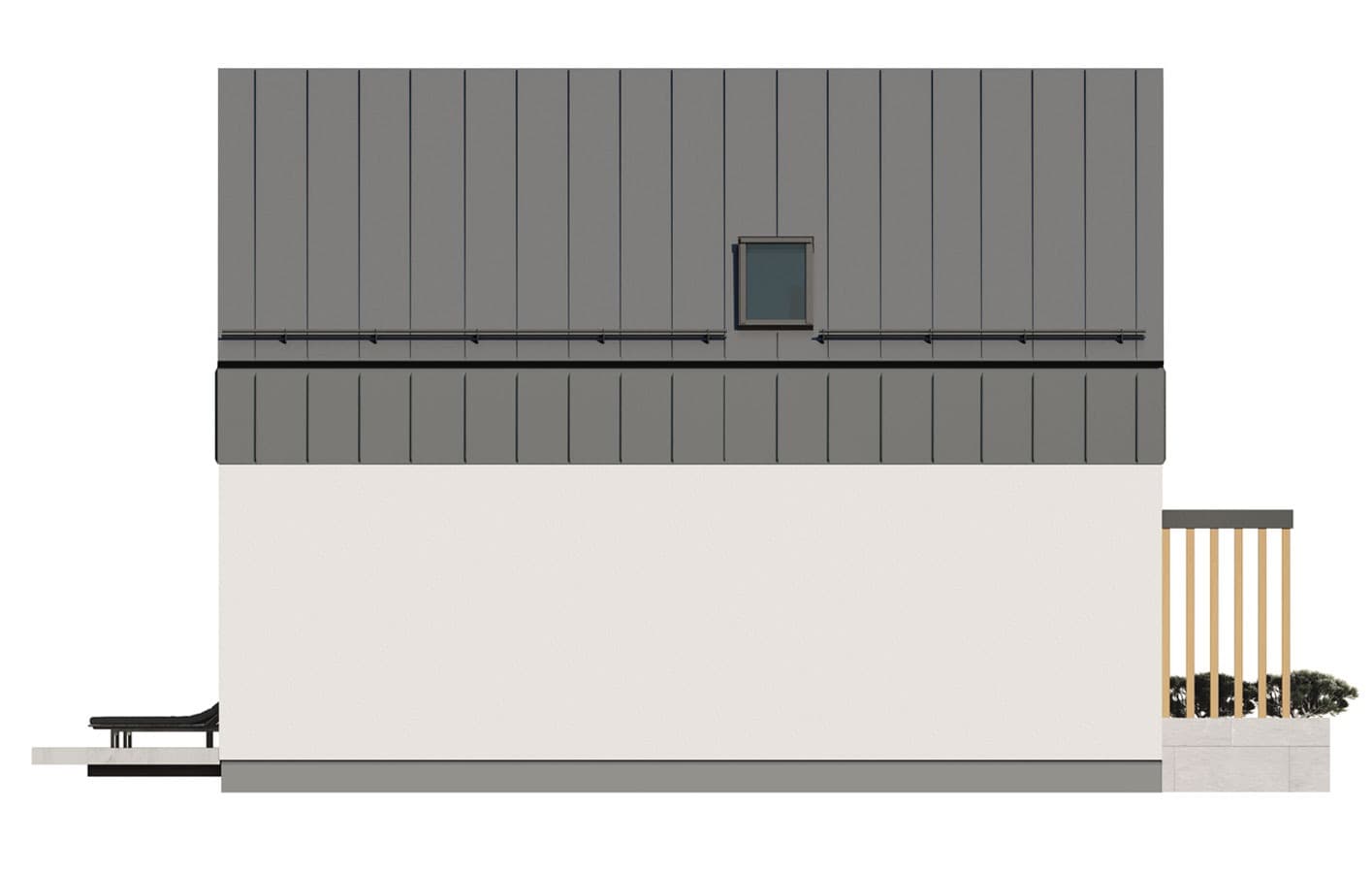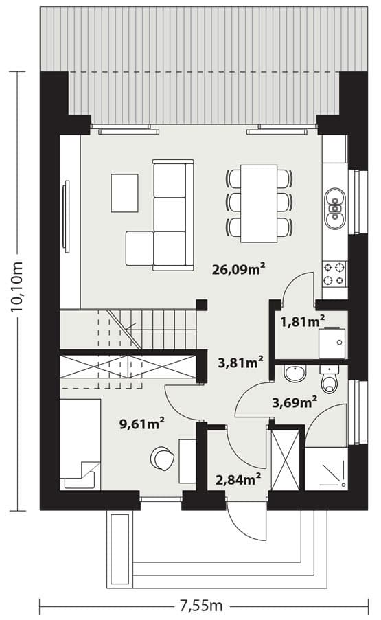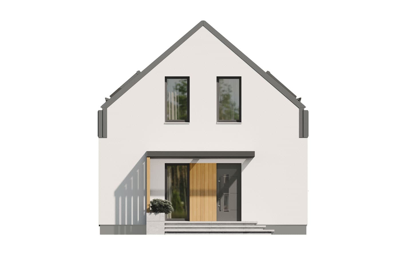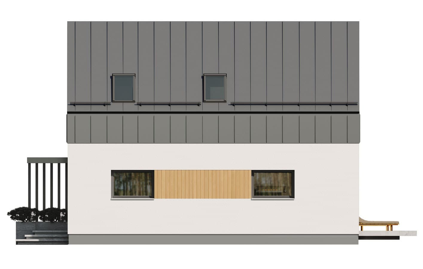 Zuza 2 to projekt niedużego domu parterowego z użytkowym poddaszem, który wpisuje się w nurt nowoczesnej architektury. Pomimo niewielkich rozmiarów projekt ten zapewnia pełen komfort mieszkania nawet 4-osobowej rodzinie. To niewielki dom parterowy o idealnie rozplanowanym układzie funkcjonalnym i nowoczesnym wyglądzie. Zuza 2 to projekt domu, który posiada powierzchnię zabudowy do 70 m2. Daje to możliwość jego budowy na zgłoszenie. Jest to też dom o szerokości pozwalającej na budowę domów na tzw. wąskiej działce. Prosta, minimalistyczna bryła na rzucie prostokąta, dwuspadowy, bezokapowy dach oraz powierzchnia zabudowy nie przekraczająca 70m2 to gwarancja niewielkich kosztów budowy. W kształtowaniu nowoczesnego wyglądu domu uwagę przykuwa blacha na rąbek w kolorze antracytowym zestawiona na zasadzie kontrastu z białym tynkiem i ciepłym naturalnym drewnem. Duże przeszklenia pozwalają na wprowadzenie do wnętrza dużych ilości naturalnego światła, co nie tylko sprawia, że pomieszczenia są jaśniejsze, ale także umożliwia cieszenie się widokiem otaczającego krajobrazu. Pomimo ograniczonej powierzchni użytkowej, układ funkcjonalny został starannie rozplanowany. Parter stanowi strefę dzienną z otwartą przestrzenią salonu, jadalni i kuchni. Dodatkowy pokój na parterze może pełnić różne funkcje, zależnie od potrzeb mieszkańców. Na parterze przewidziano również łazienkę oraz pomieszczenie gospodarcze, w którym zaprojektowano pompę ciepła. Na poddaszu zaprojektowano trzy funkcjonalne sypialnie, łazienkę oraz pralnię. Optymalne wykorzystanie przestrzeni na poddaszu umożliwia komfortowe warunki dla mieszkańców. Dom o takich gabarytach to oczywiście niższe koszty zarówno w fazie budowy, jak i w trakcie późniejszej eksploatacji. Mniejsza powierzchnia zabudowy oznacza także możliwość zakupu mniejszej działki, co może wpływać na korzystniejszy wybór lokalizacji. Projekt domu Zuza 2 to doskonałe połączenie nowoczesnego designu, funkcjonalności oraz zrównoważonego podejścia do zagadnień budowlanych, co sprawia, że stanowi on atrakcyjną opcję dla tych, którzy cenią sobie komfort życia w mniejszych, nowoczesnych domach.
