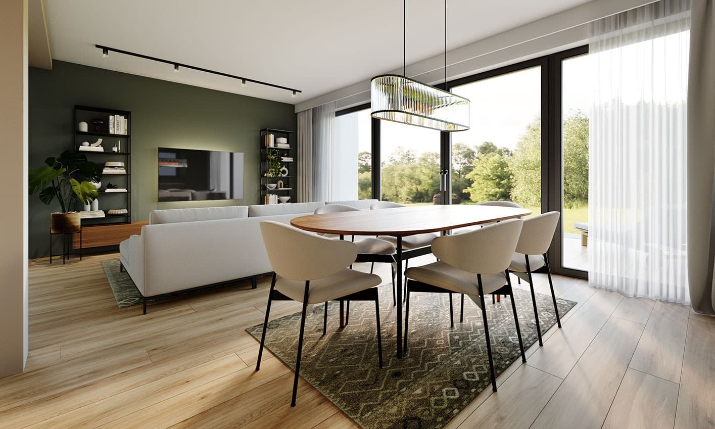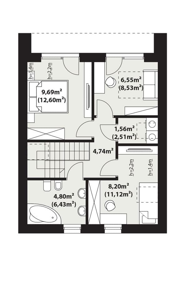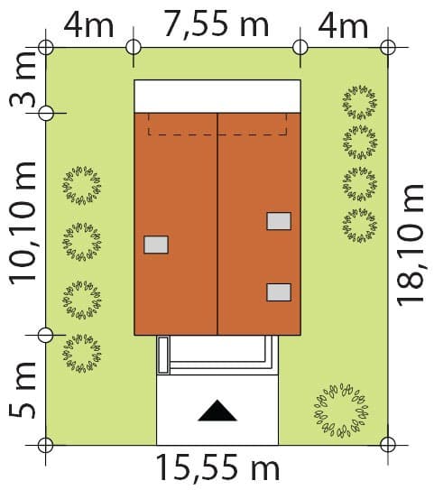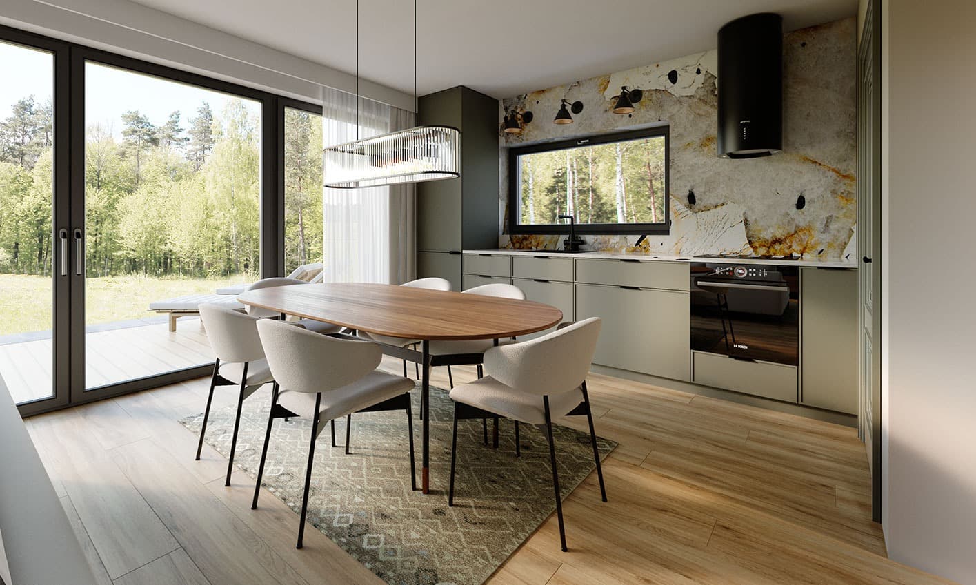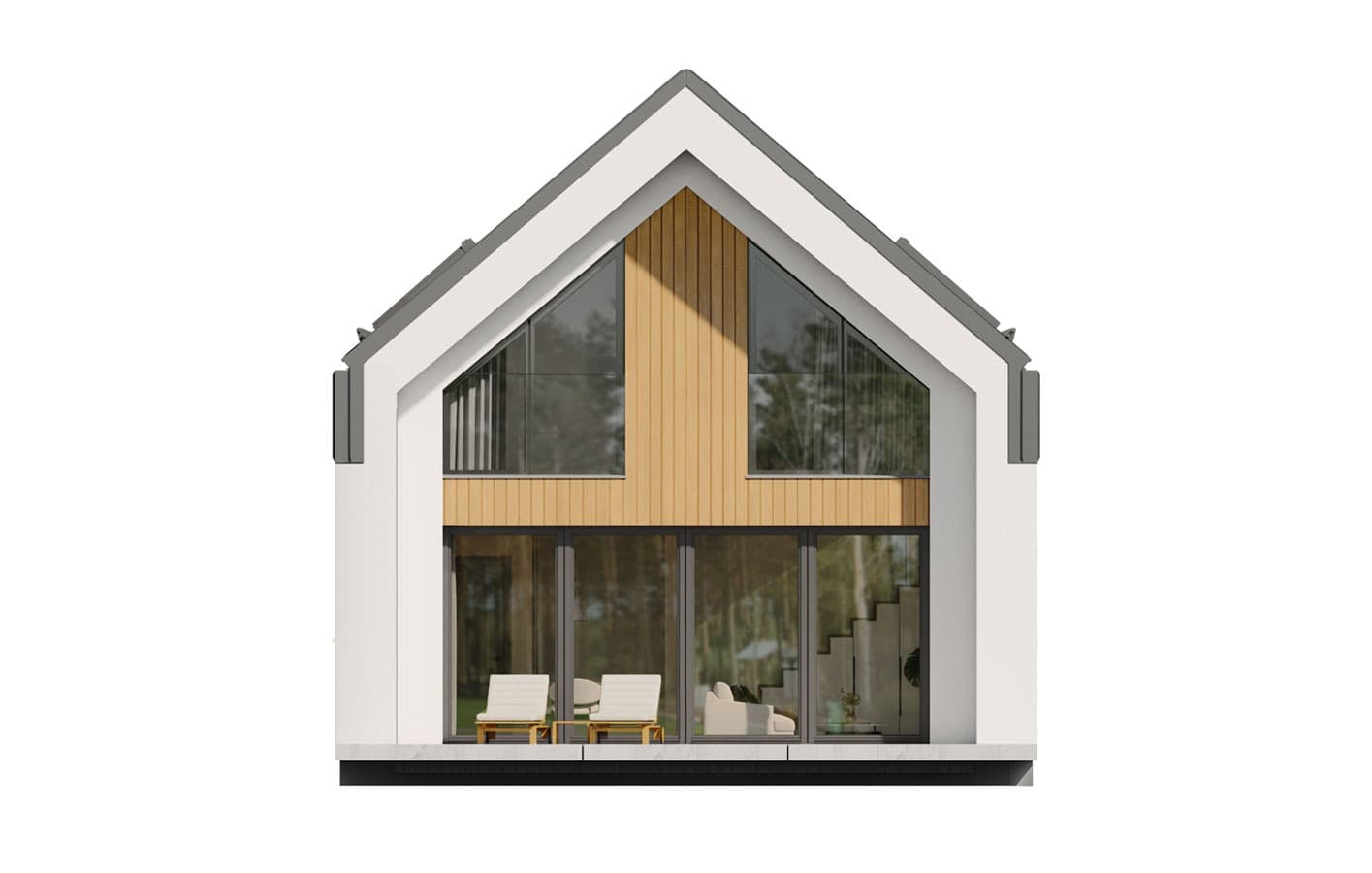 Zuza 2 to projekt niedużego domu parterowego z użytkowym poddaszem, który wpisuje się w nurt nowoczesnej architektury. Pomimo niewielkich rozmiarów projekt ten zapewnia pełen komfort mieszkania nawet 4-osobowej rodzinie. To niewielki dom parterowy o idealnie rozplanowanym układzie funkcjonalnym i nowoczesnym wyglądzie. Zuza 2 to projekt domu, który posiada powierzchnię zabudowy do 70 m2. Daje to możliwość jego budowy na zgłoszenie. Jest to też dom o szerokości pozwalającej na budowę domów na tzw. wąskiej działce. Prosta, minimalistyczna bryła na rzucie prostokąta, dwuspadowy, bezokapowy dach oraz powierzchnia zabudowy nie przekraczająca 70m2 to gwarancja niewielkich kosztów budowy. W kształtowaniu nowoczesnego wyglądu domu uwagę przykuwa blacha na rąbek w kolorze antracytowym zestawiona na zasadzie kontrastu z białym tynkiem i ciepłym naturalnym drewnem. Duże przeszklenia pozwalają na wprowadzenie do wnętrza dużych ilości naturalnego światła, co nie tylko sprawia, że pomieszczenia są jaśniejsze, ale także umożliwia cieszenie się widokiem otaczającego krajobrazu. Pomimo ograniczonej powierzchni użytkowej, układ funkcjonalny został starannie rozplanowany. Parter stanowi strefę dzienną z otwartą przestrzenią salonu, jadalni i kuchni. Dodatkowy pokój na parterze może pełnić różne funkcje, zależnie od potrzeb mieszkańców. Na parterze przewidziano również łazienkę oraz pomieszczenie gospodarcze, w którym zaprojektowano pompę ciepła. Na poddaszu zaprojektowano trzy funkcjonalne sypialnie, łazienkę oraz pralnię. Optymalne wykorzystanie przestrzeni na poddaszu umożliwia komfortowe warunki dla mieszkańców. Dom o takich gabarytach to oczywiście niższe koszty zarówno w fazie budowy, jak i w trakcie późniejszej eksploatacji. Mniejsza powierzchnia zabudowy oznacza także możliwość zakupu mniejszej działki, co może wpływać na korzystniejszy wybór lokalizacji. Projekt domu Zuza 2 to doskonałe połączenie nowoczesnego designu, funkcjonalności oraz zrównoważonego podejścia do zagadnień budowlanych, co sprawia, że stanowi on atrakcyjną opcję dla tych, którzy cenią sobie komfort życia w mniejszych, nowoczesnych domach.