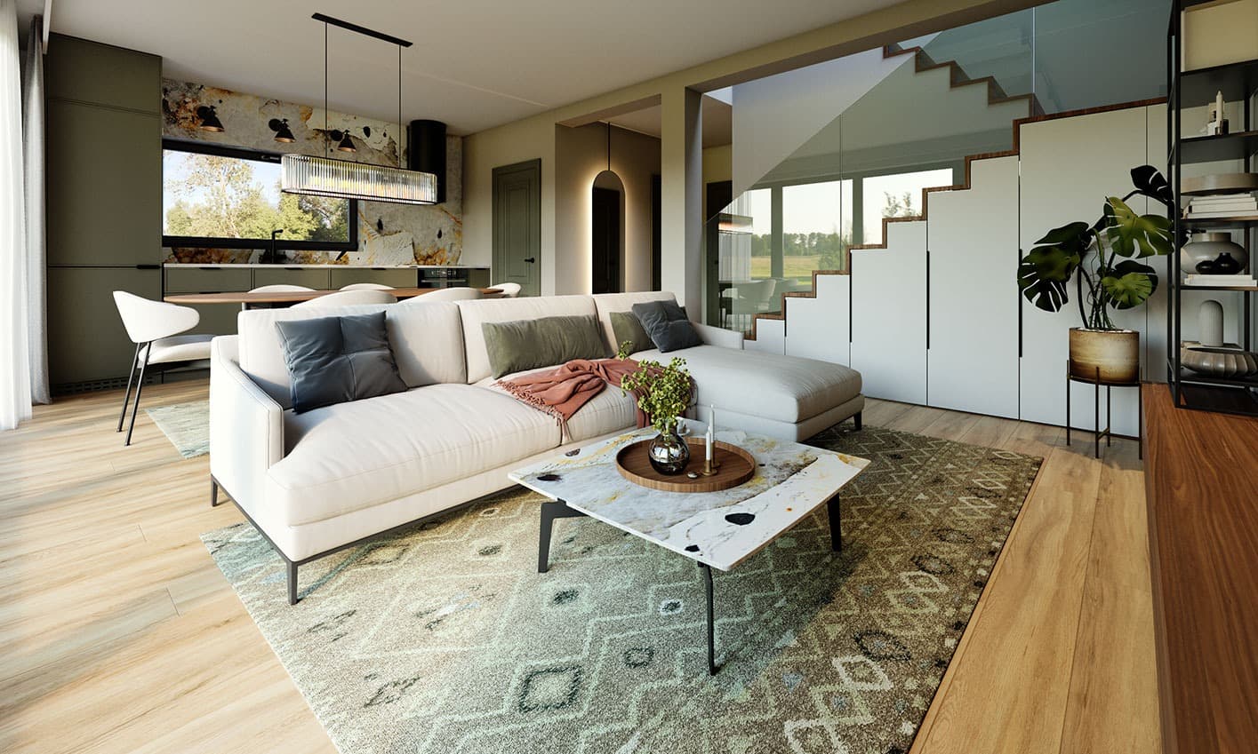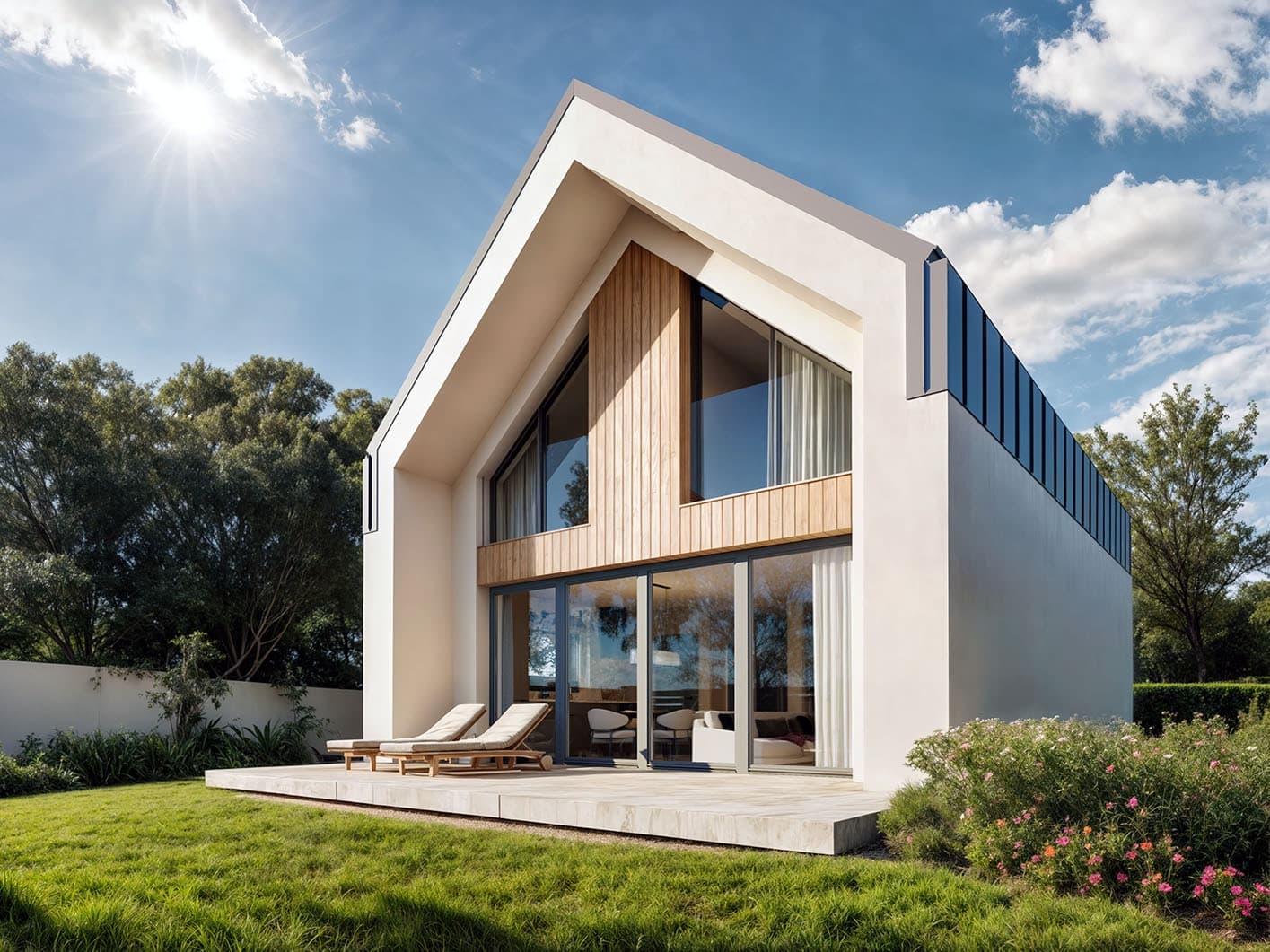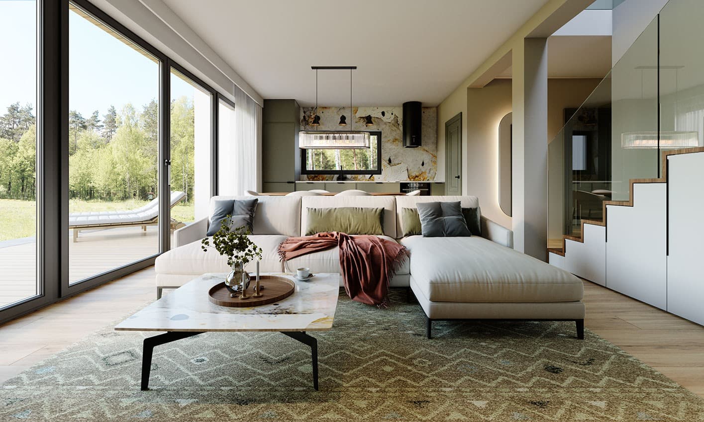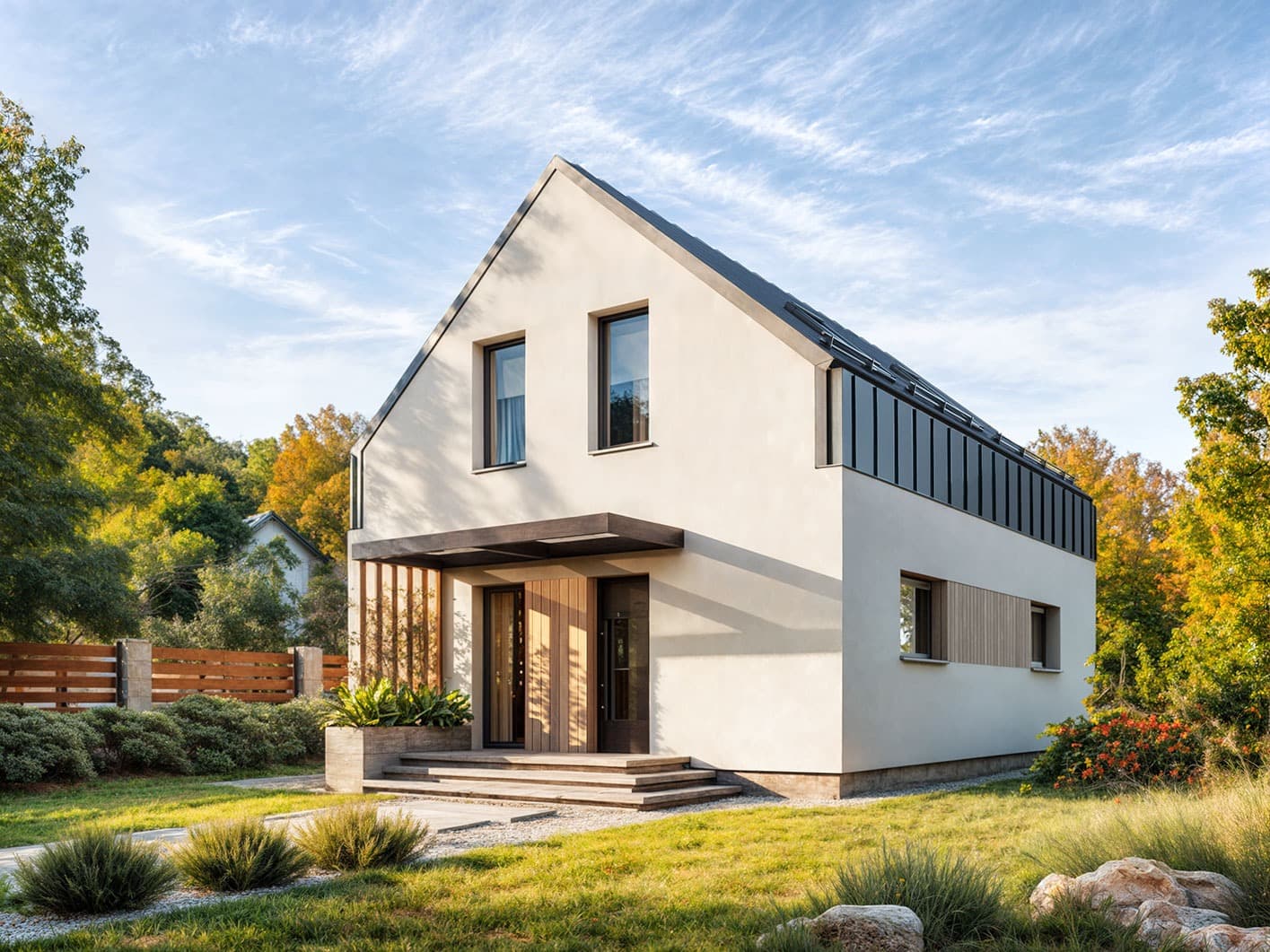 Zuza 2 to projekt niedużego domu parterowego z użytkowym poddaszem, który wpisuje się w nurt nowoczesnej architektury. Pomimo niewielkich rozmiarów projekt ten zapewnia pełen komfort mieszkania nawet 4-osobowej rodzinie. To niewielki dom parterowy o idealnie rozplanowanym układzie funkcjonalnym i nowoczesnym wyglądzie. Zuza 2 to projekt domu, który posiada powierzchnię zabudowy do 70 m2. Daje to możliwość jego budowy na zgłoszenie. Jest to też dom o szerokości pozwalającej na budowę domów na tzw. wąskiej działce. Prosta, minimalistyczna bryła na rzucie prostokąta, dwuspadowy, bezokapowy dach oraz powierzchnia zabudowy nie przekraczająca 70m2 to gwarancja niewielkich kosztów budowy. W kształtowaniu nowoczesnego wyglądu domu uwagę przykuwa blacha na rąbek w kolorze antracytowym zestawiona na zasadzie kontrastu z białym tynkiem i ciepłym naturalnym drewnem. Duże przeszklenia pozwalają na wprowadzenie do wnętrza dużych ilości naturalnego światła, co nie tylko sprawia, że pomieszczenia są jaśniejsze, ale także umożliwia cieszenie się widokiem otaczającego krajobrazu. Pomimo ograniczonej powierzchni użytkowej, układ funkcjonalny został starannie rozplanowany. Parter stanowi strefę dzienną z otwartą przestrzenią salonu, jadalni i kuchni. Dodatkowy pokój na parterze może pełnić różne funkcje, zależnie od potrzeb mieszkańców. Na parterze przewidziano również łazienkę oraz pomieszczenie gospodarcze, w którym zaprojektowano pompę ciepła. Na poddaszu zaprojektowano trzy funkcjonalne sypialnie, łazienkę oraz pralnię. Optymalne wykorzystanie przestrzeni na poddaszu umożliwia komfortowe warunki dla mieszkańców. Dom o takich gabarytach to oczywiście niższe koszty zarówno w fazie budowy, jak i w trakcie późniejszej eksploatacji. Mniejsza powierzchnia zabudowy oznacza także możliwość zakupu mniejszej działki, co może wpływać na korzystniejszy wybór lokalizacji. Projekt domu Zuza 2 to doskonałe połączenie nowoczesnego designu, funkcjonalności oraz zrównoważonego podejścia do zagadnień budowlanych, co sprawia, że stanowi on atrakcyjną opcję dla tych, którzy cenią sobie komfort życia w mniejszych, nowoczesnych domach.
